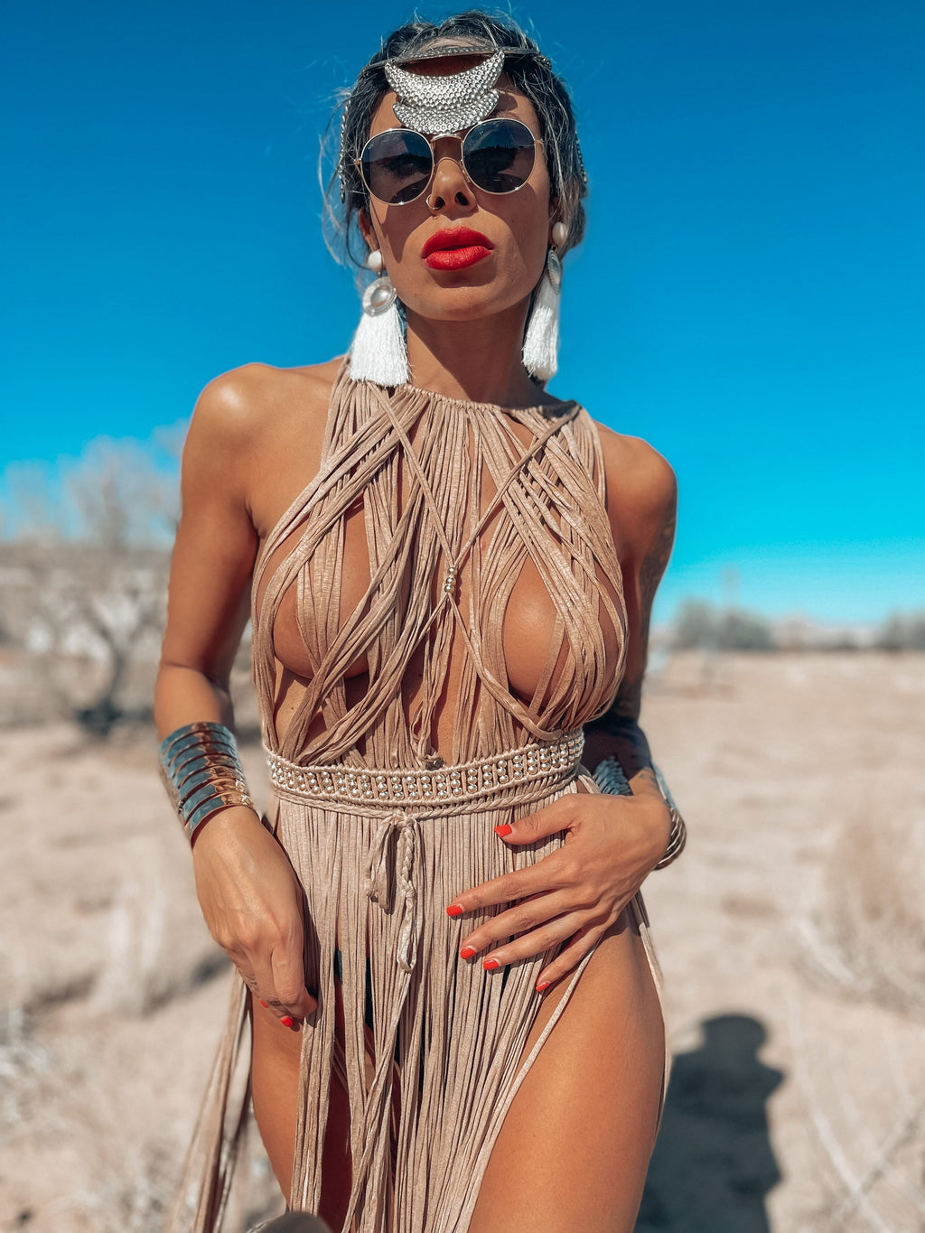 Boho Acrylic Macrame Like Beaded Fringe Festival Top Goddess Dress Bachelorette Party Concert Costume