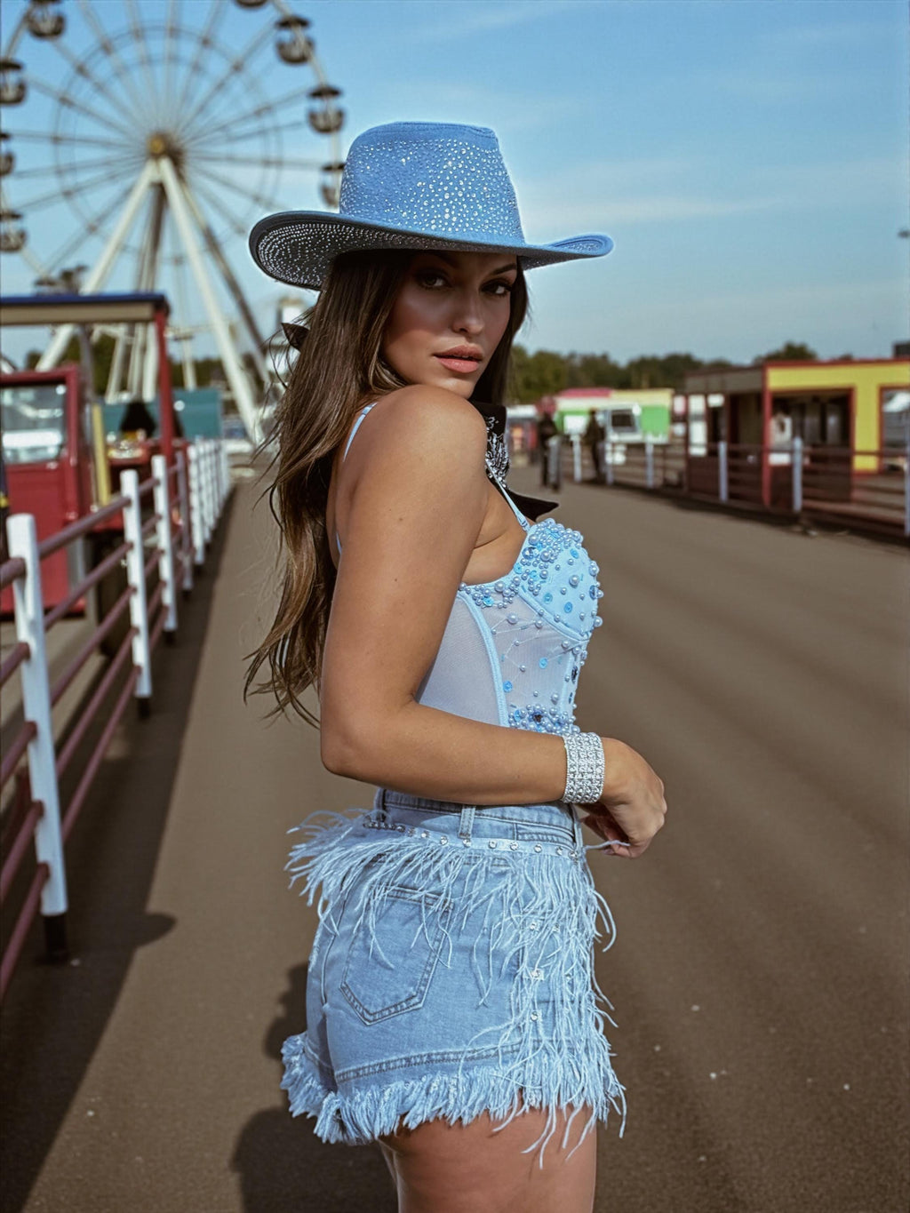 Pearl Denim Long Top, Lace Festival Top, White Cowgirl Top, Cowgirl Denim Top, Country Bachelorette Outfit Top, Bridal Corset