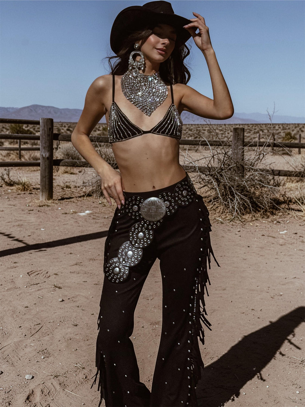 Black Fringe Faux Suede Bell Bottom Pants, Faux Suede Flared Cowgirl Pants, Fringe Festival Studded Pants