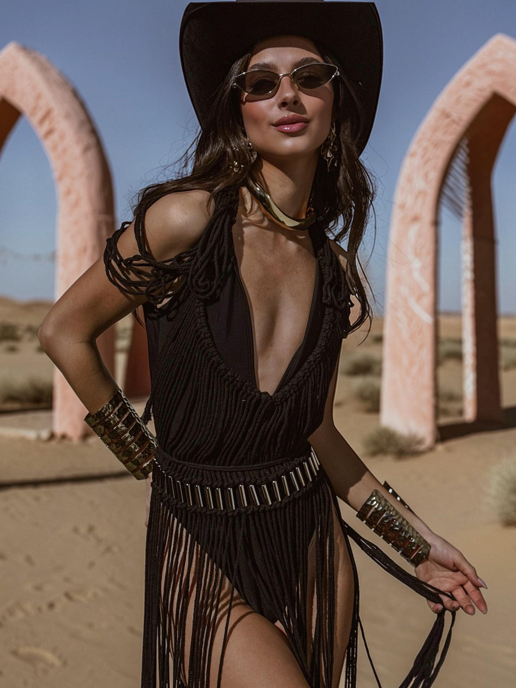 BLACK Macrame Gold Beaded Goddess Top, Fringe Macrame Dress, Burning Man Cleopatra Dress, Desert Queen Outfit, Rave Festival Outfit