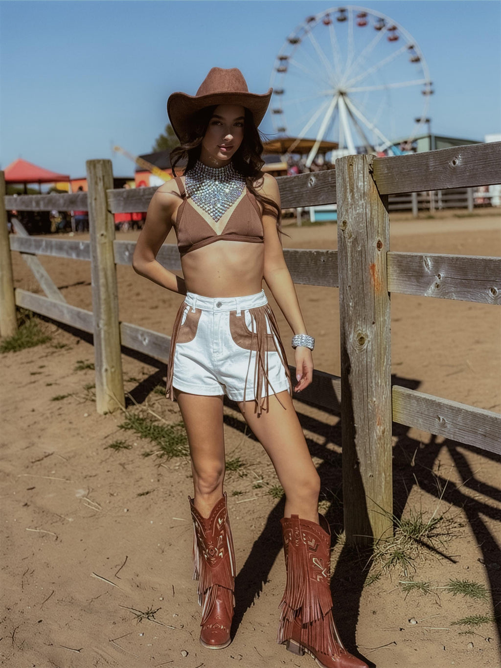 Denim faux Suede Fringe Western Shorts, White Cowgirl festival Shorts, Fringe White Shorts, Boho Rodeo Fringe Outfit, Disco Cowboy Outfit