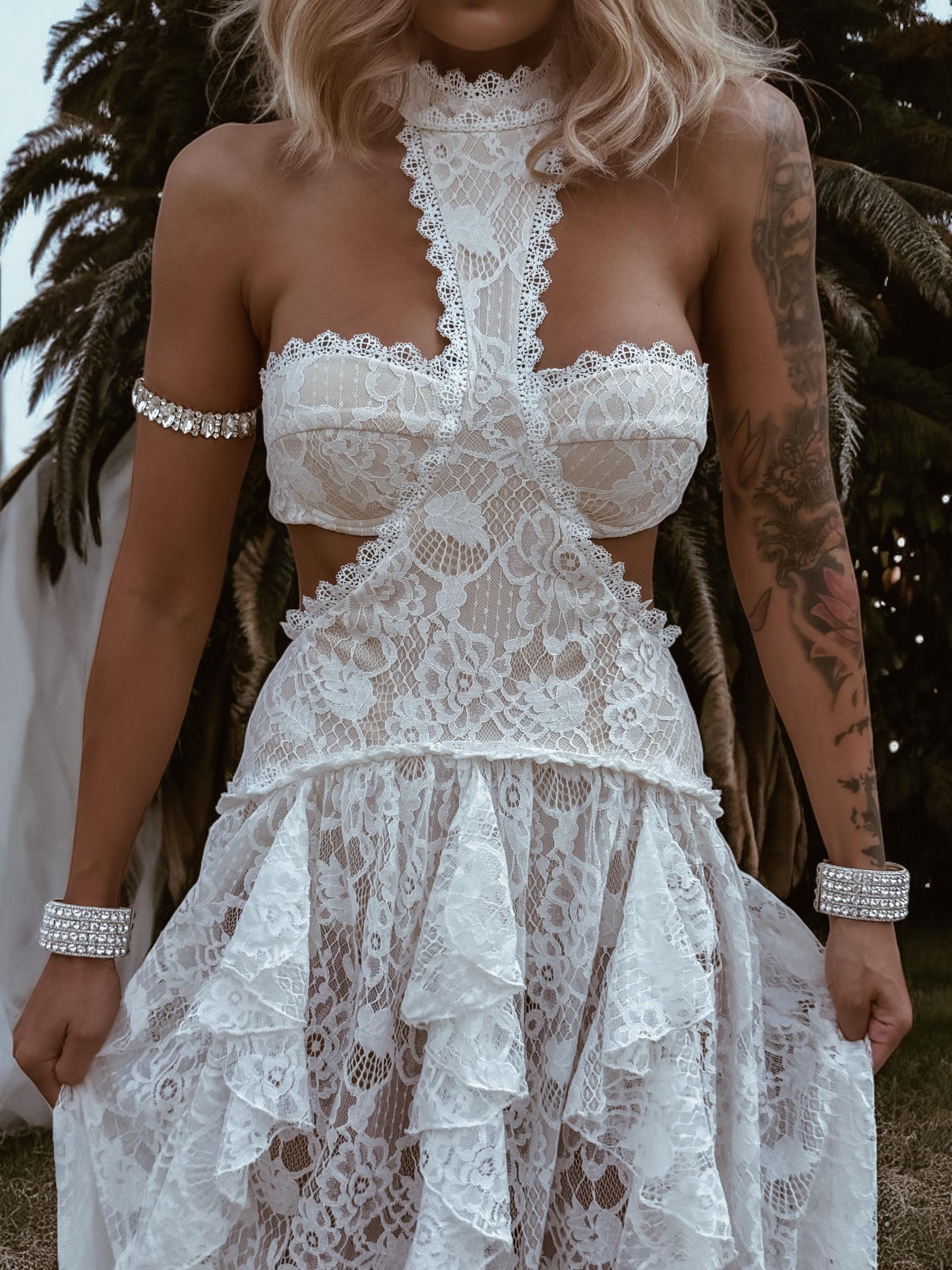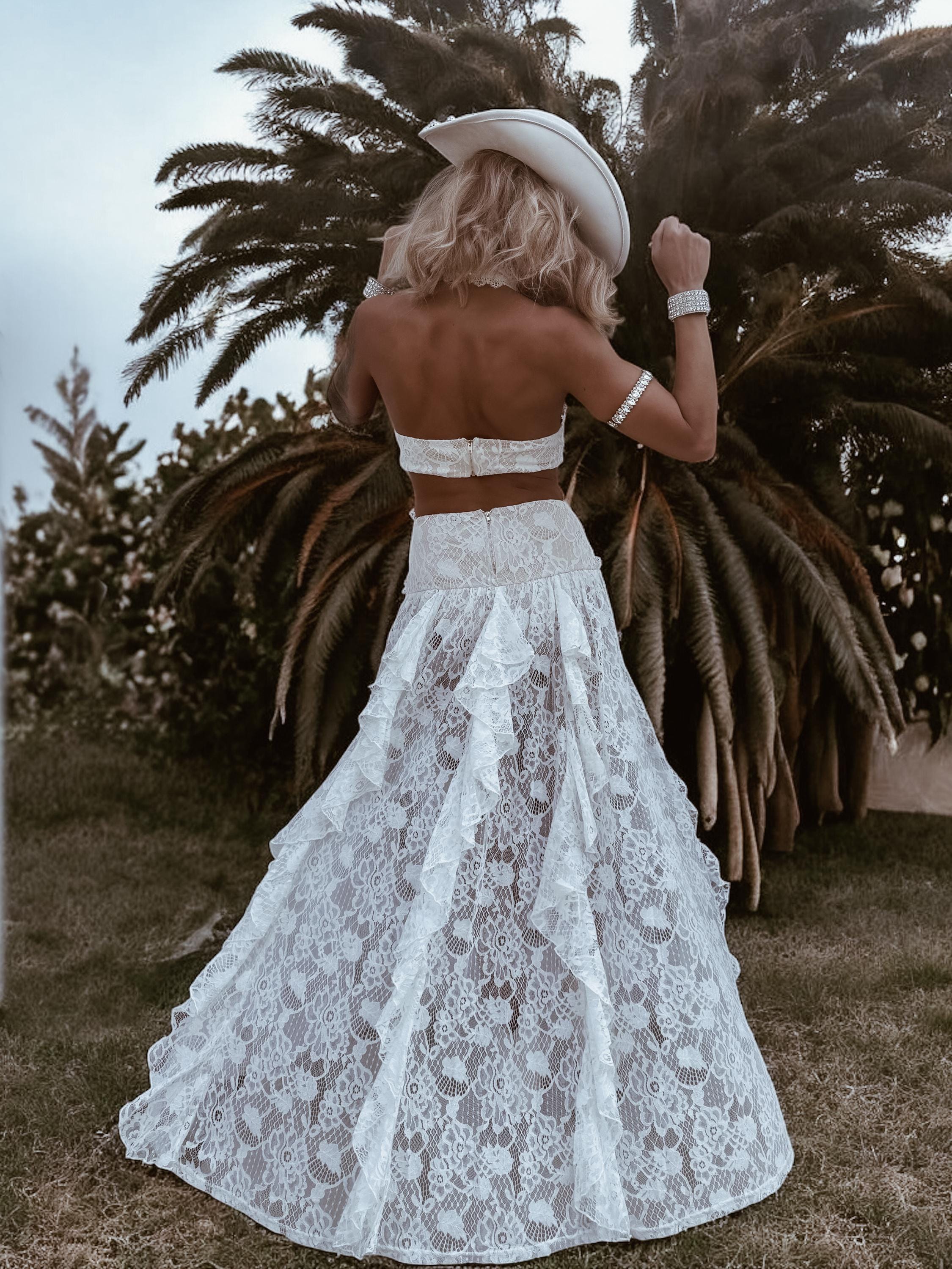 A dress made for the wild and free bride – this bohemian lace maxi is equal parts romantic, daring, and unforgettable. With a nude base, delicate lace overlay, playful cut-outs, and ruffled details, it’s the perfect blend of western charm and boho goddess energy.