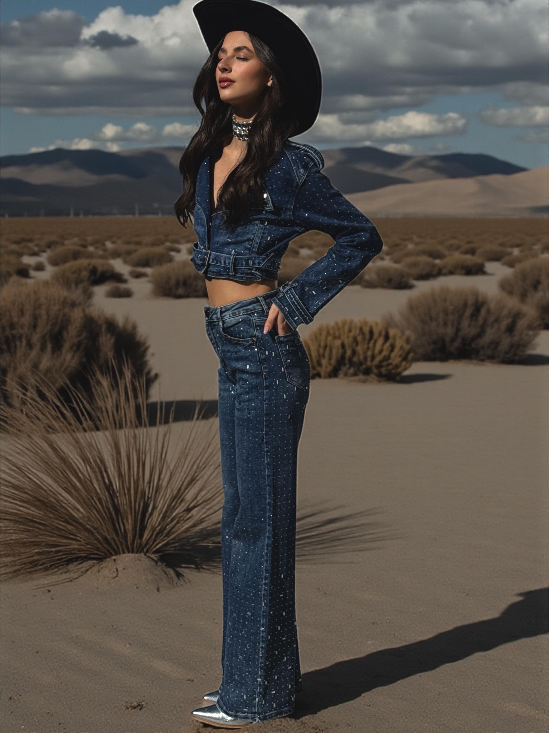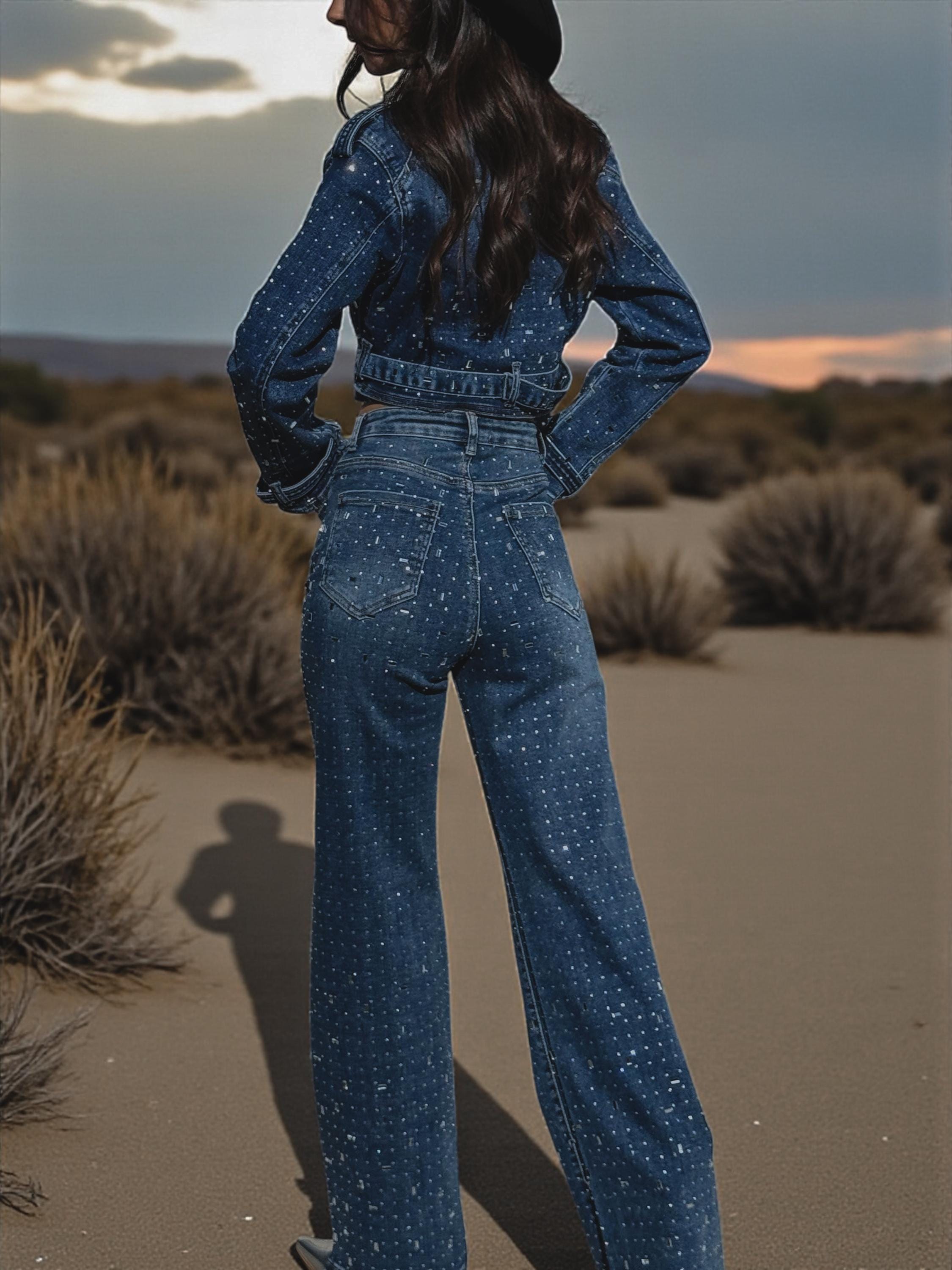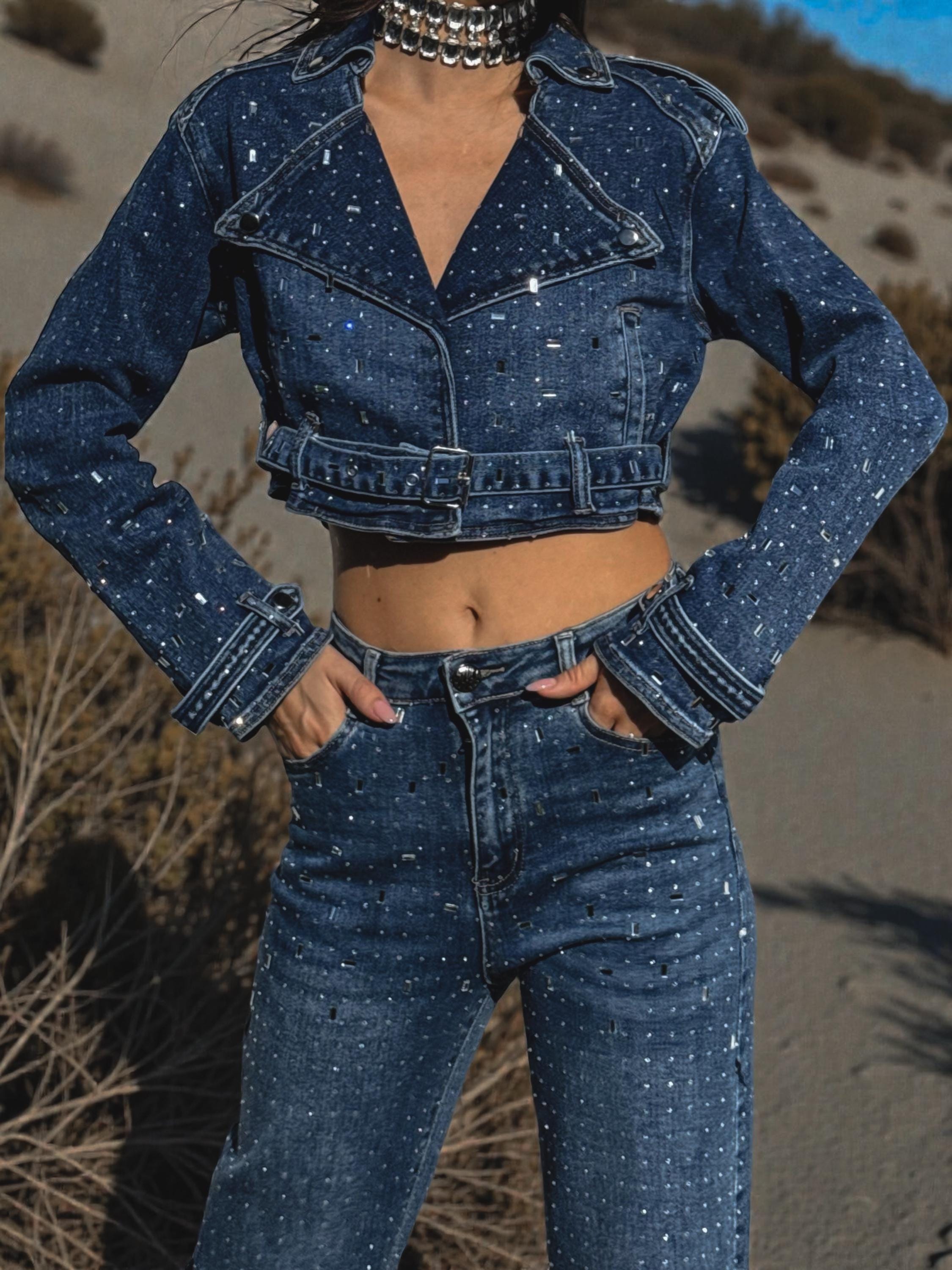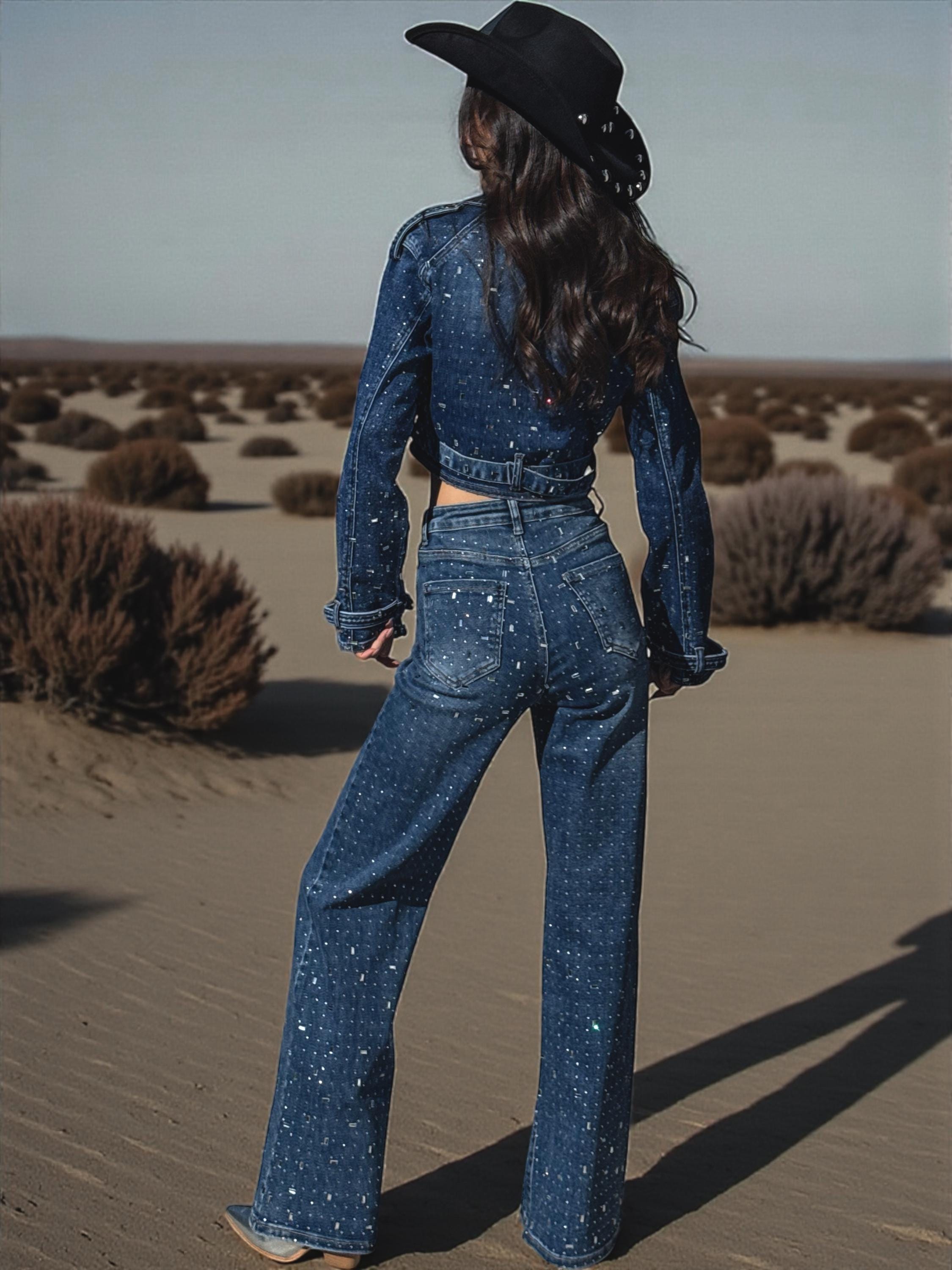 Fully embellished with radiant diamond rhinestones, this two-piece set delivers extreme shine while keeping that iconic western-festival edge. Crafted from a rich medium-dark wash denim, the set includes high-waisted wide-leg jeans that elongate the silhouette and a cropped retro-cut long sleeve jean jacket that adds structure and attitude.