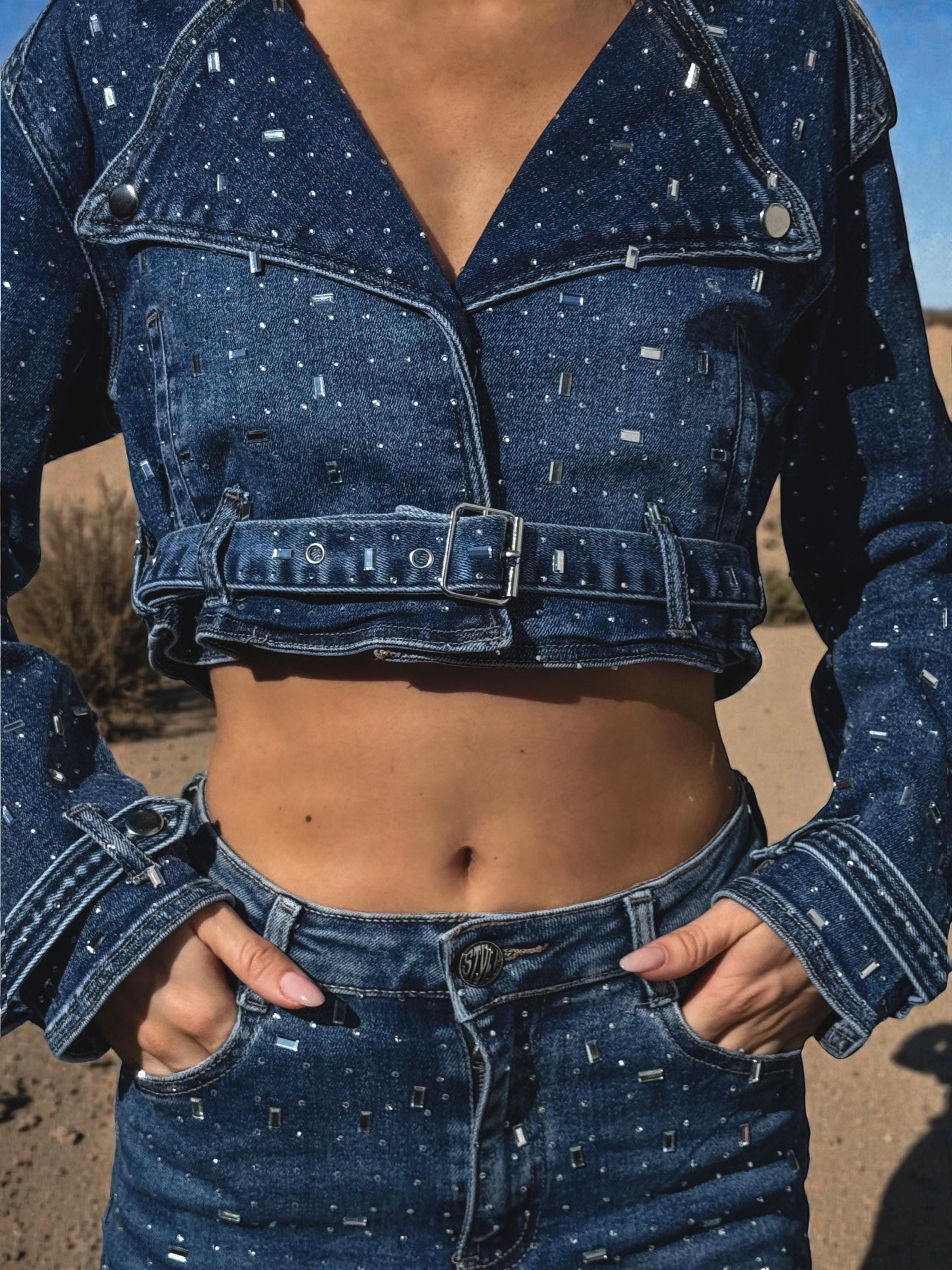 Steal the spotlight from sunrise to after-dark in this Diamond Jeans Festival Set — a denim duo designed to sparkle under every light.