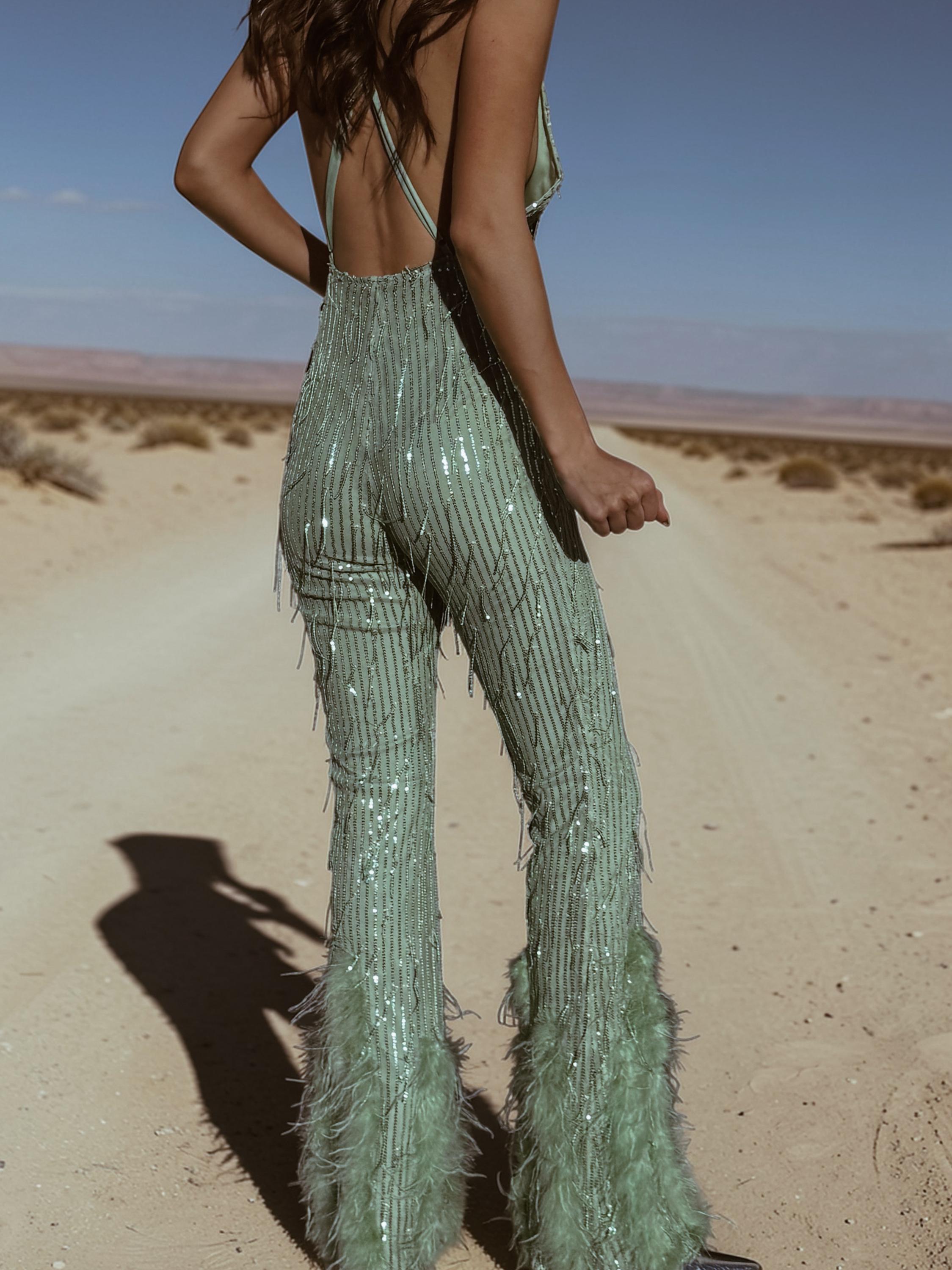 From stage lights to sunset desert skies, this jumpsuit was designed to shine — bold, radiant, and unapologetically iconic.