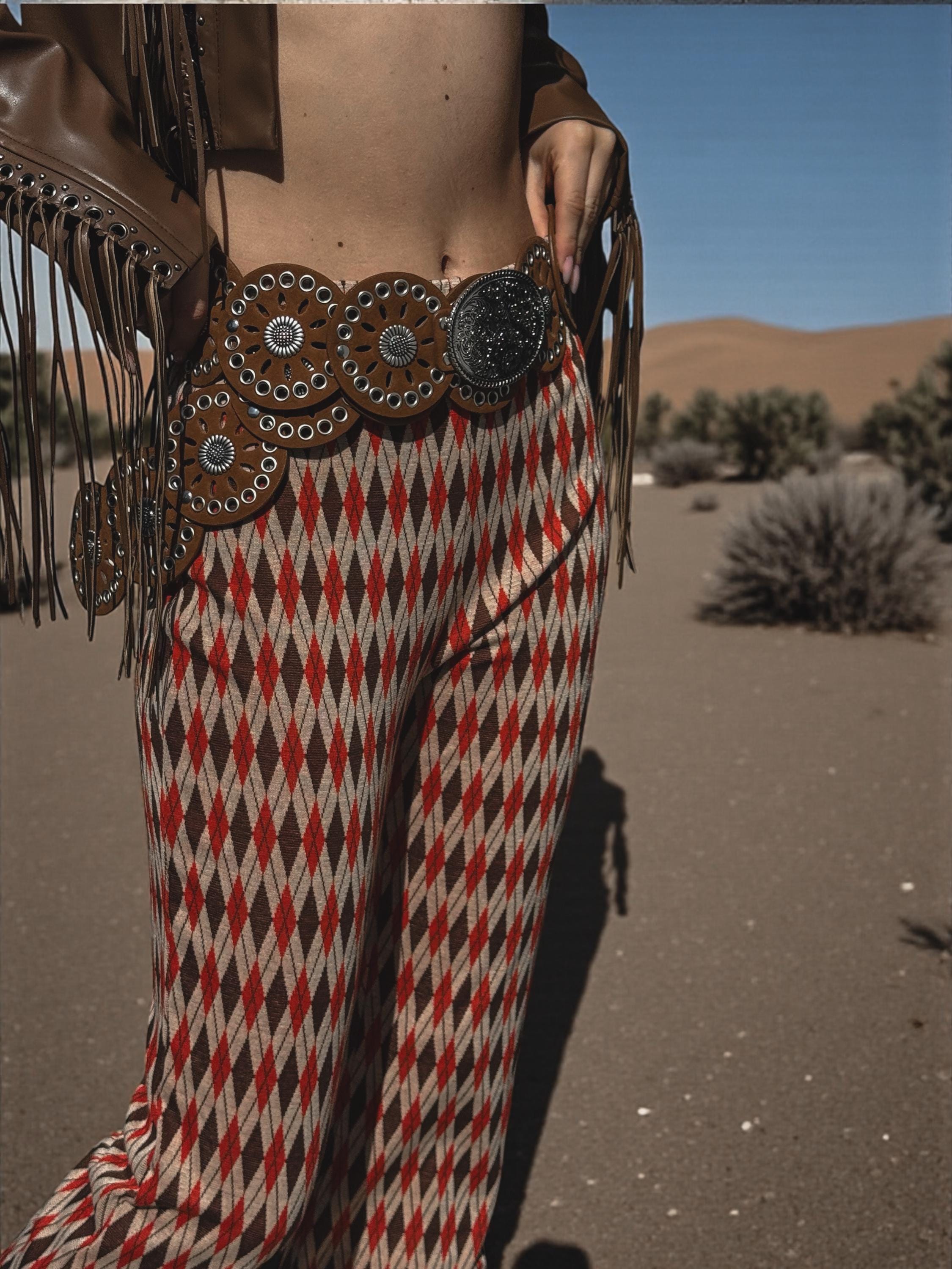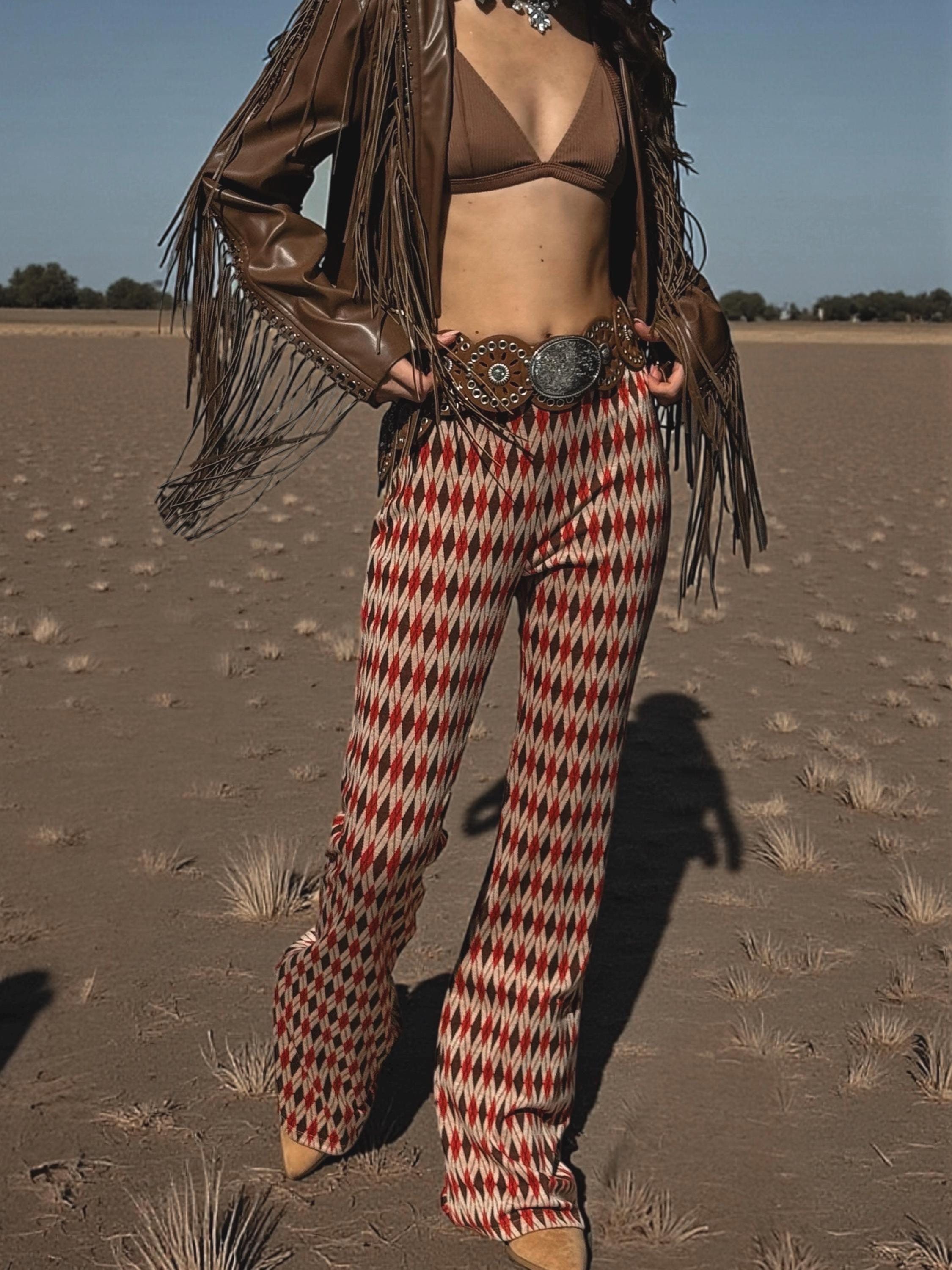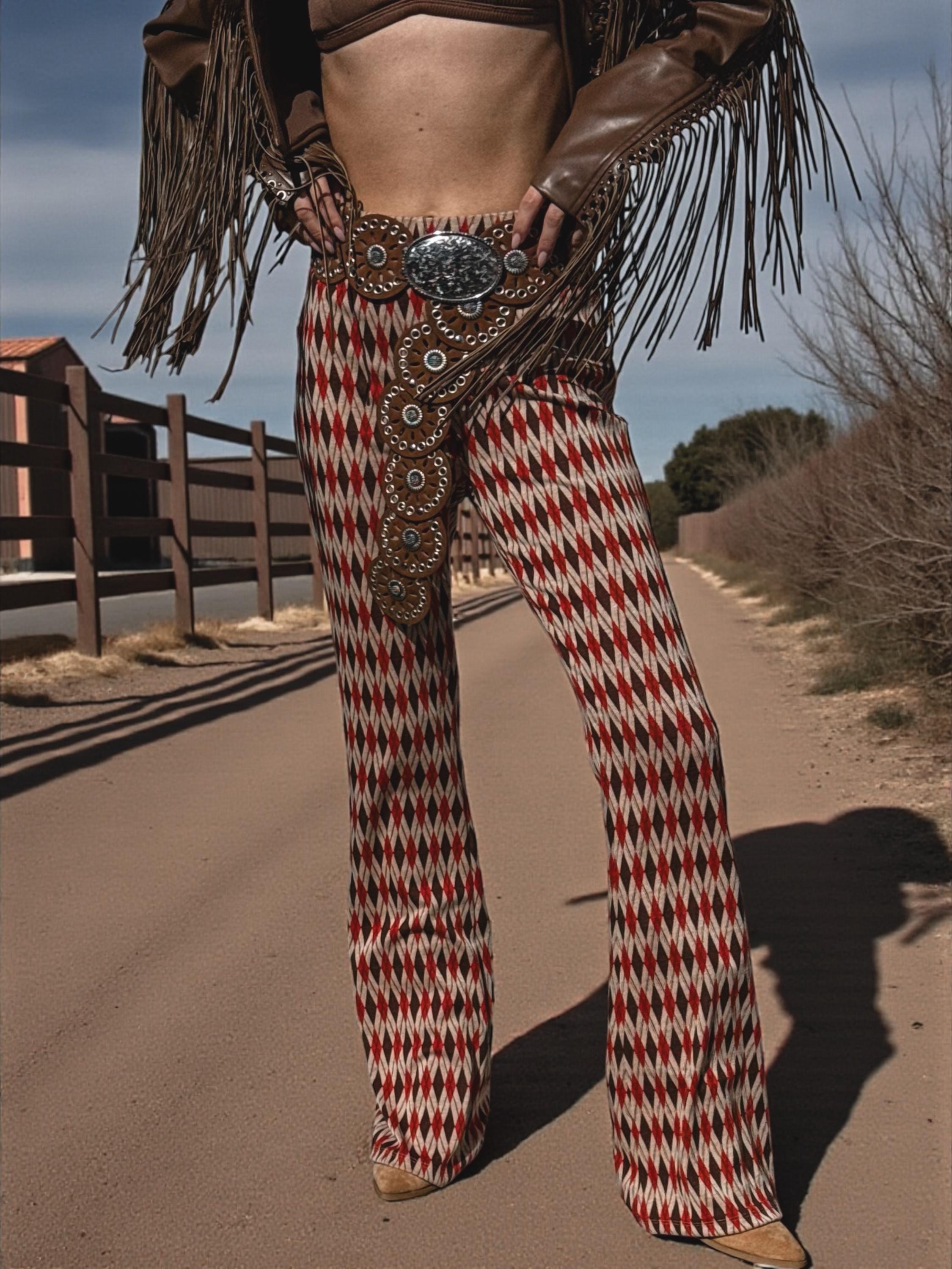 Crafted from a textured woven fabric, these statement pants feature a vibrant diamond pattern in rich multi-color tones that instantly evoke vintage western and hippie festival energy. The dramatic bell bottom flare elongates the legs while creating beautiful movement with every step.