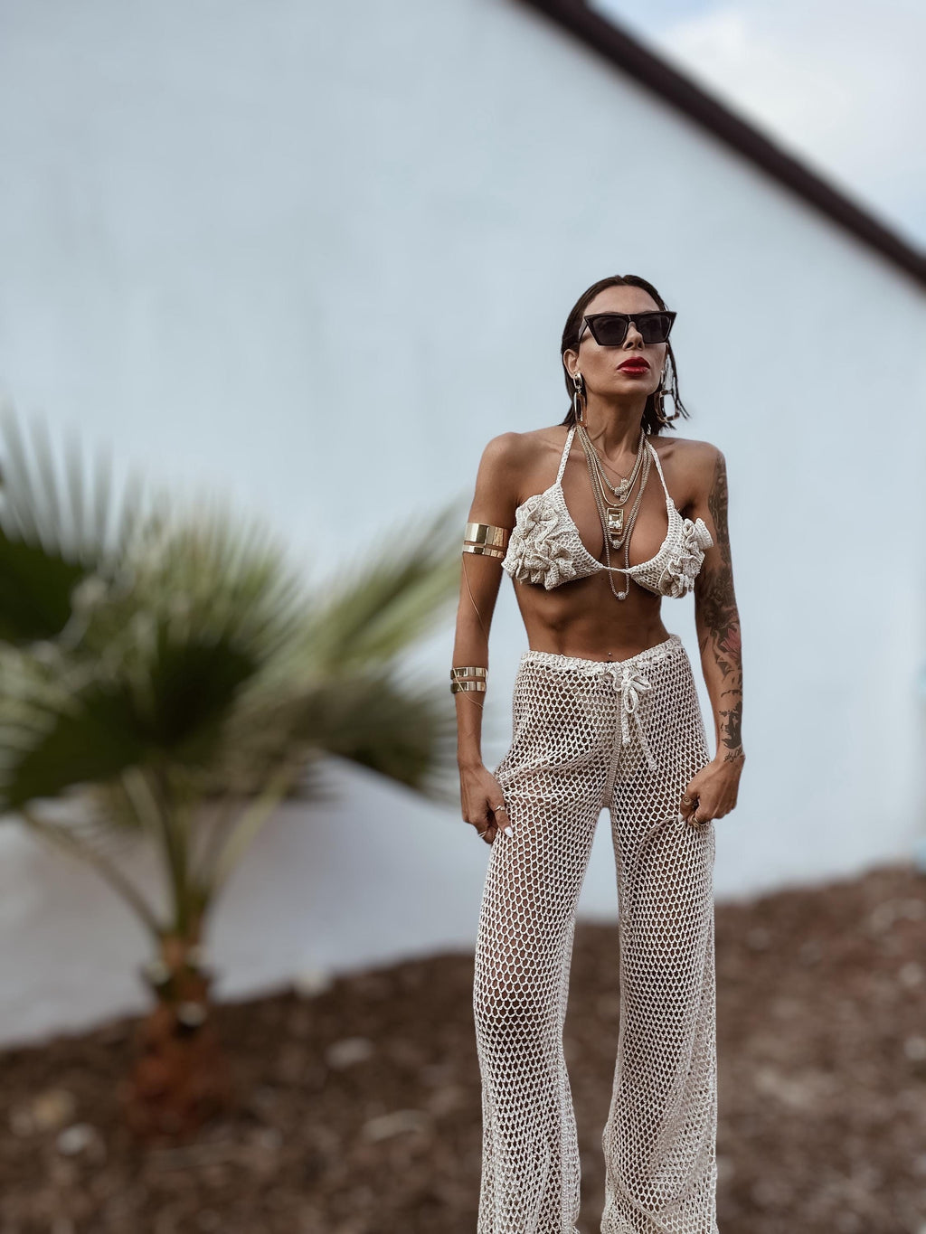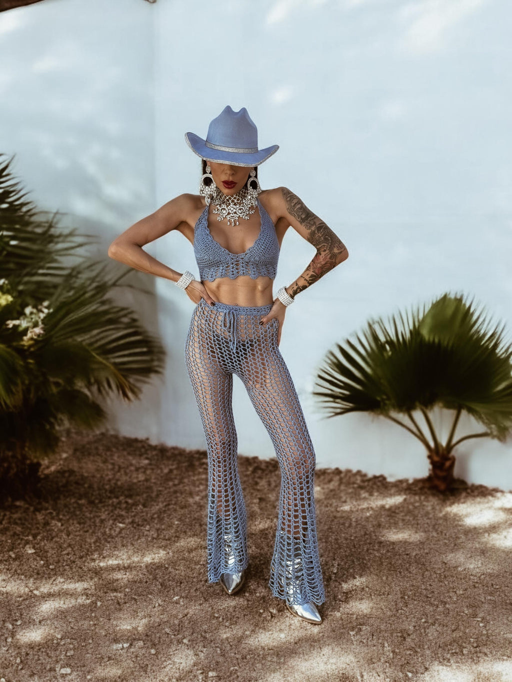 Bohemian Crochet Knit Festival Set Crocheted Pants And Top Bachelorette Outfit Fringe Cowgirl Flare Pants Goddess Outfit