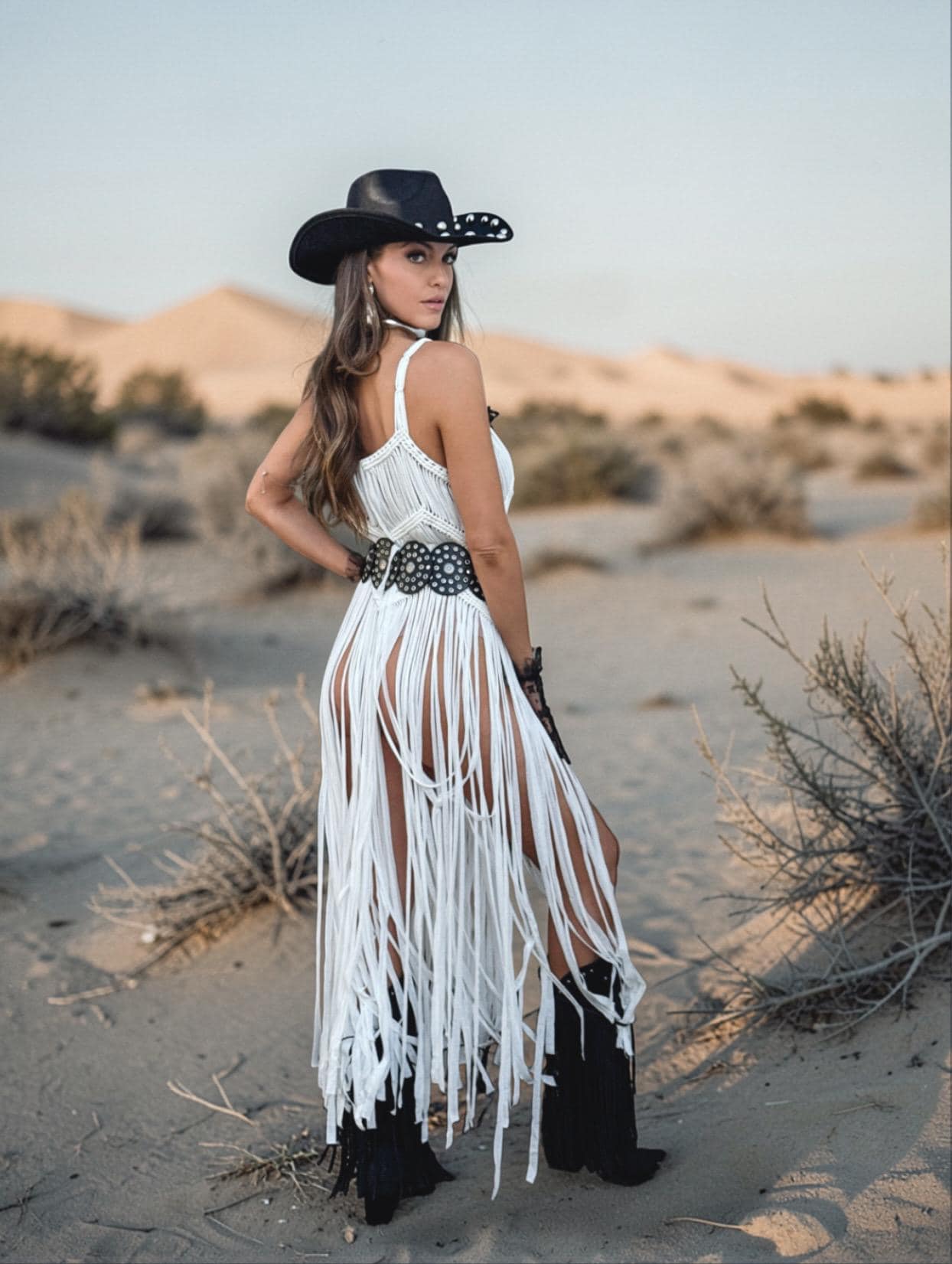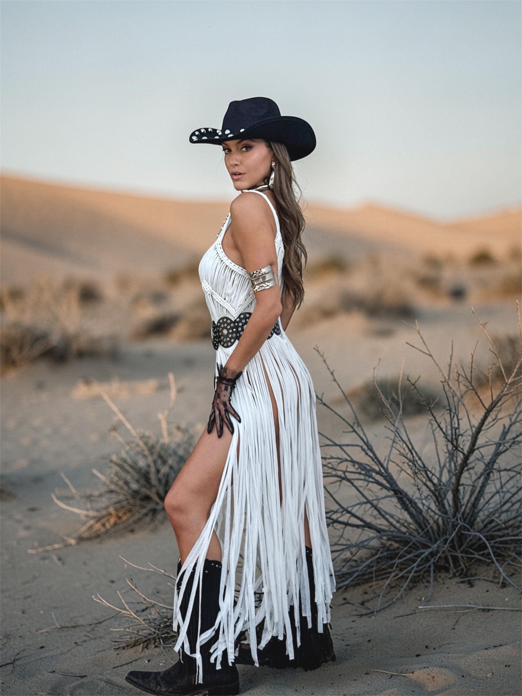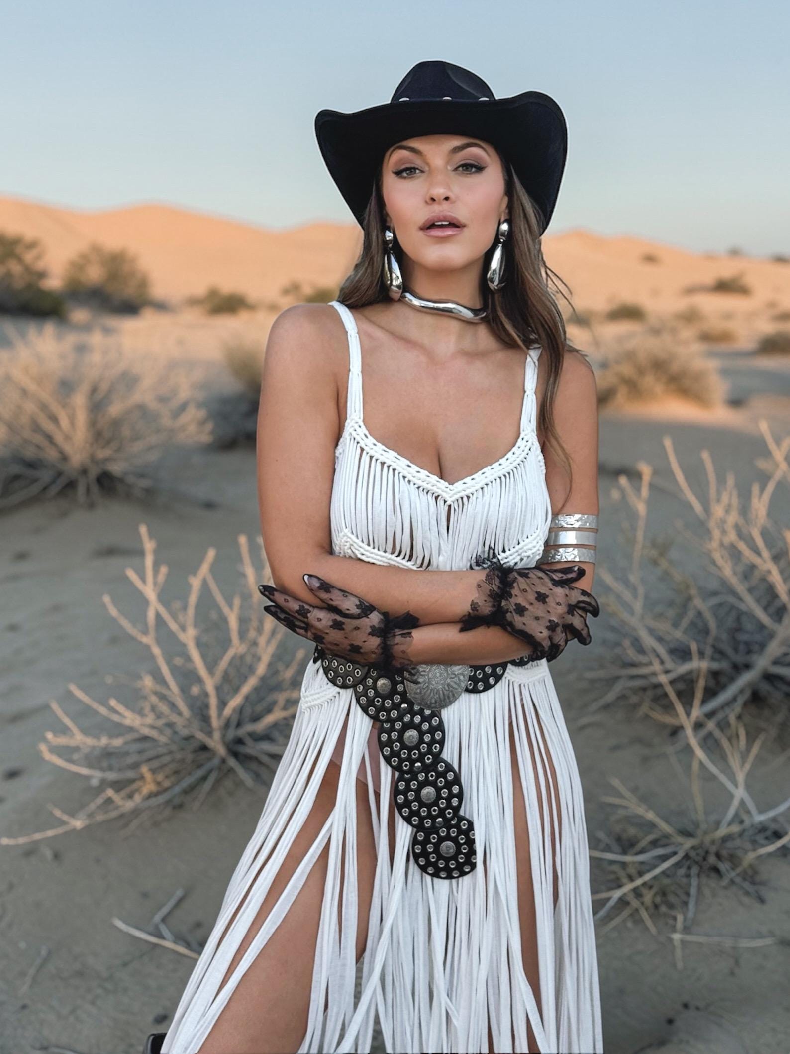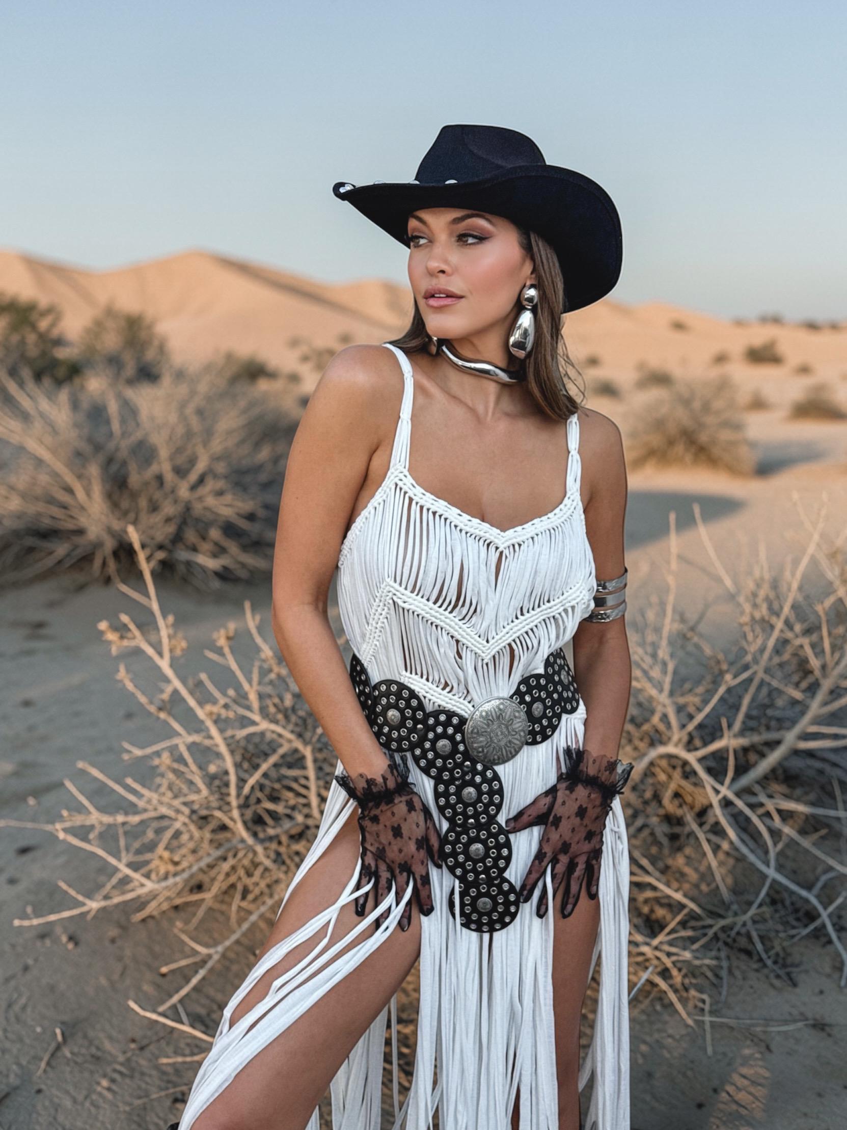 Wear it as a full festival overlay dress or style it solo for daring, high-impact looks. For an elevated western glam moment, pair it with our structured denim corset to create a sculpted, layered silhouette that blends soft boho with cowgirl edge.