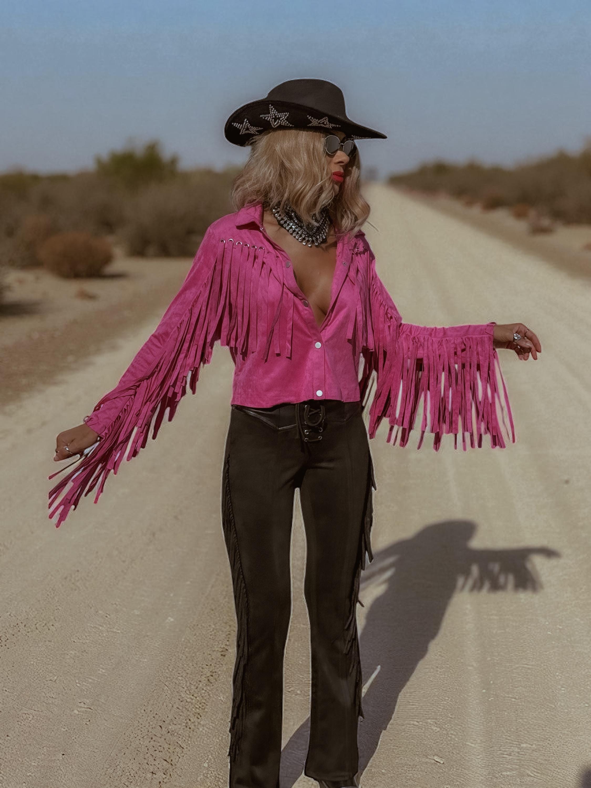 Bring the heat to your next festival, concert, or bachelorette party with this hot pink faux suede fringe shirt jacket. Designed for the modern cowgirl, this piece blends bold western glam with playful, feminine energy.