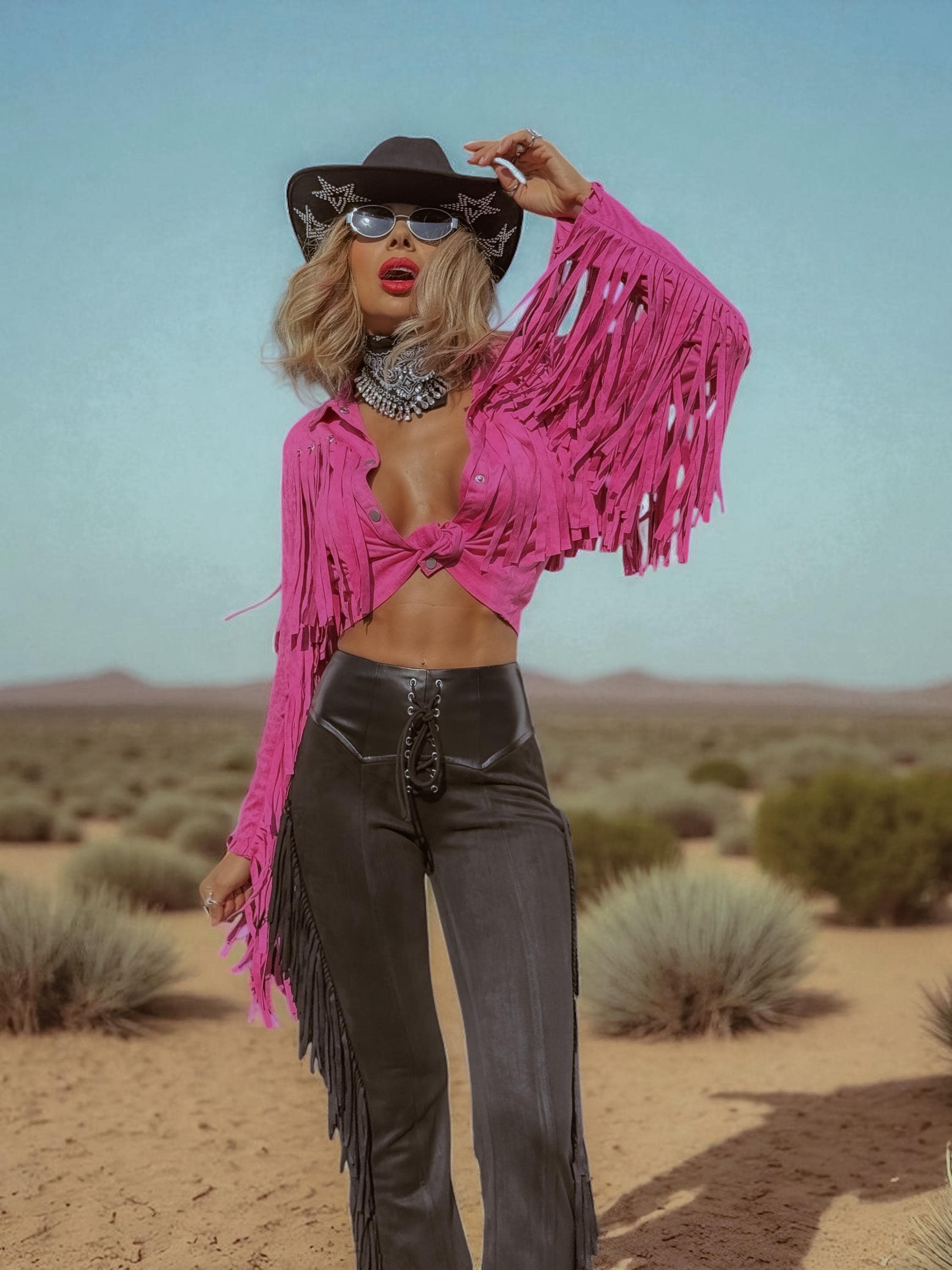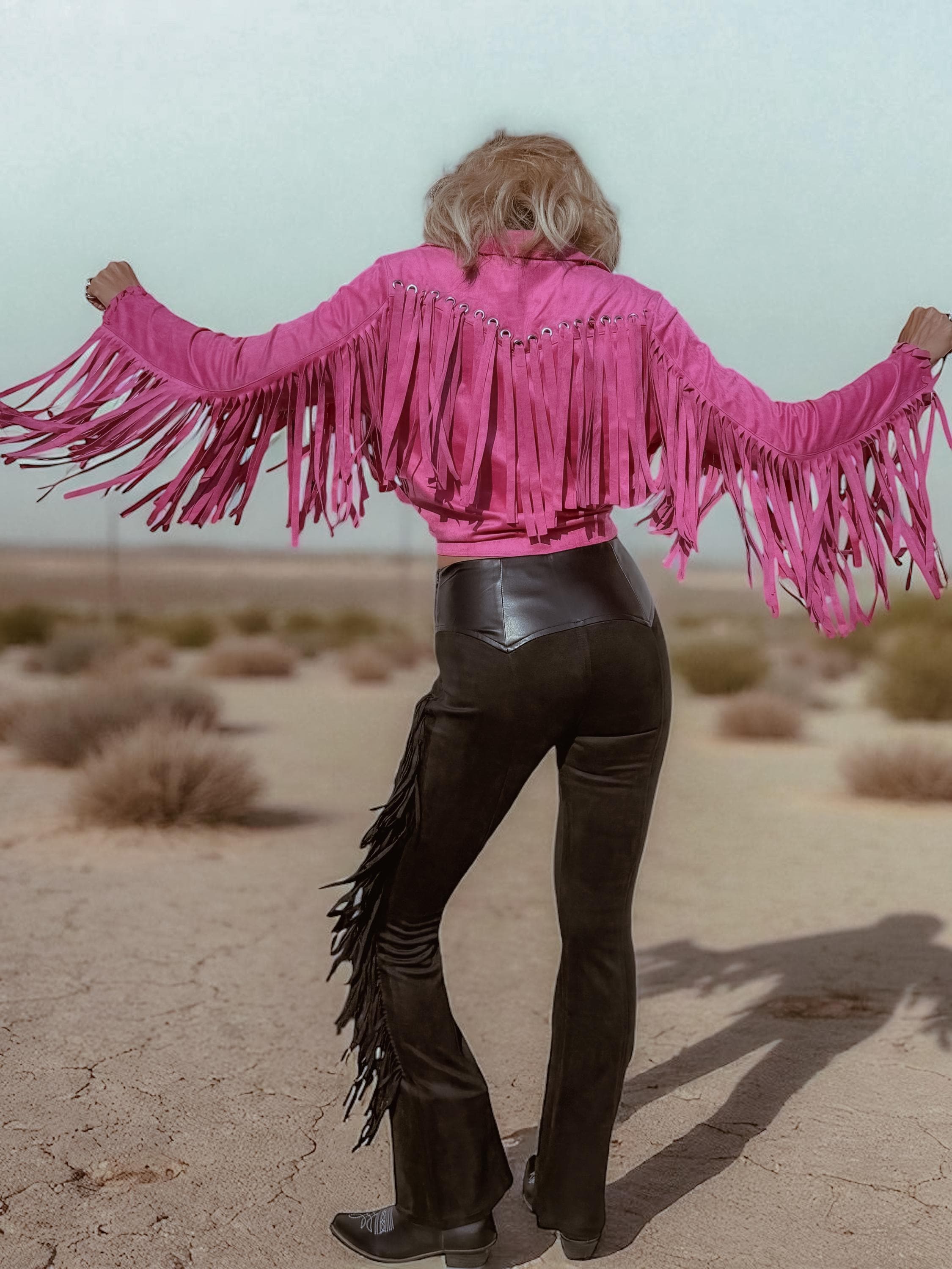 This statement jacket is made for festival queens, rave nights, and western glam adventures. Whether you’re dancing under desert skies or celebrating with your girls, the bold pink fringe ensures all eyes are on you.