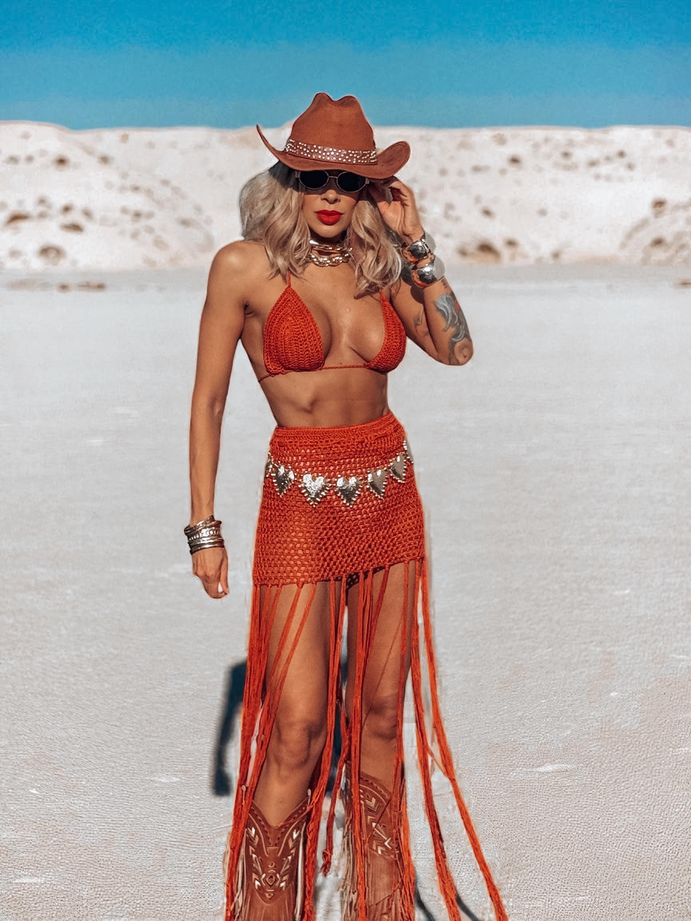 Turn heads with this burnt orange / rust crochet fringe skirt set, designed for the bold and free-spirited goddess.