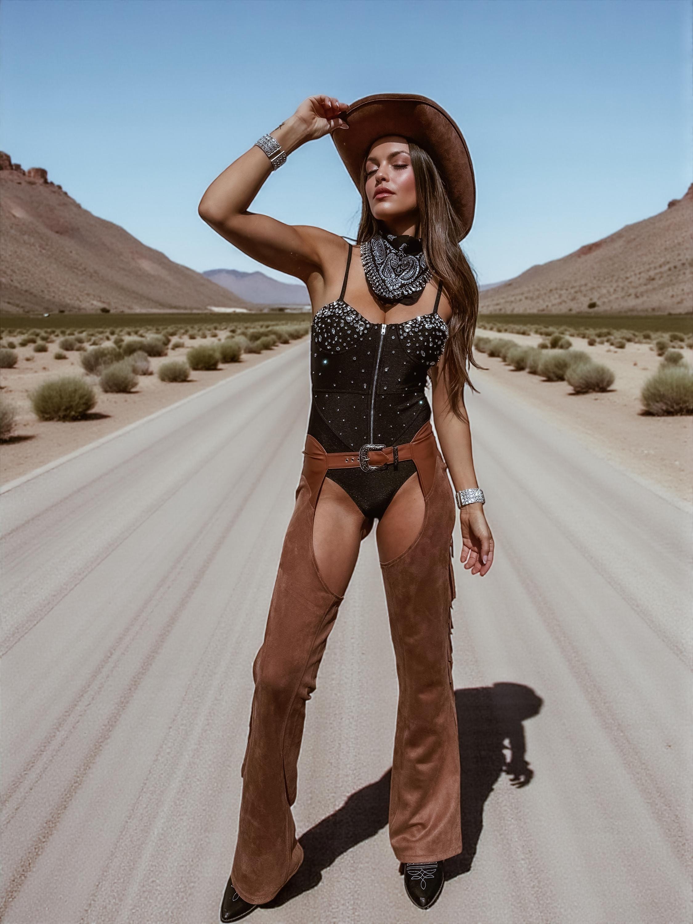 This crystal-embellished bodysuit is the perfect mix of western glam and festival chic. Designed to catch the light and turn heads, it’s an essential piece for anyone who loves to shine with confidence.