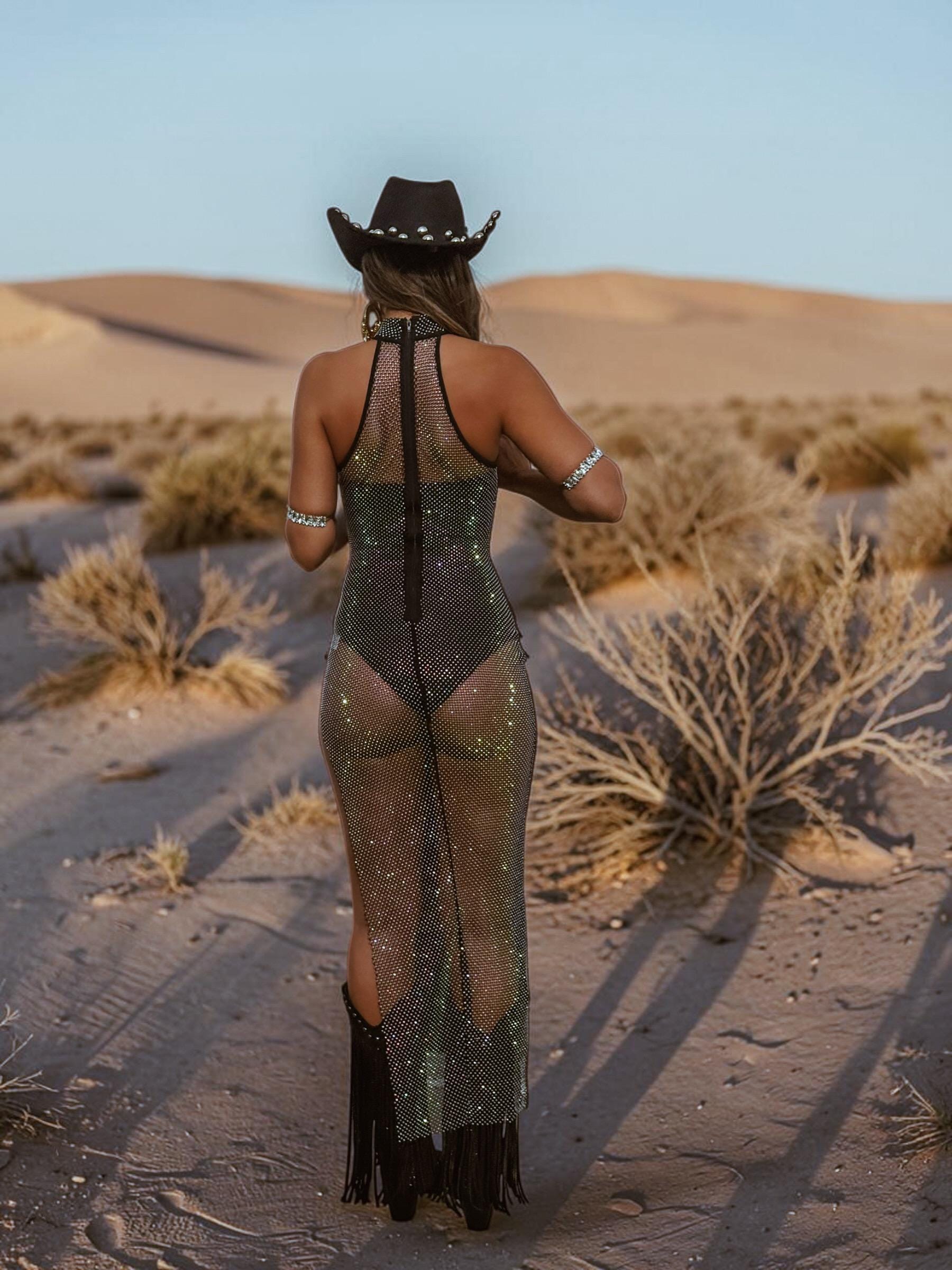 Black Diamond Festival Dress, Crystal Festival Cowgirl Outfit, Sparkle Rave Dress, Western Disco Dress, Embellished Night Dress