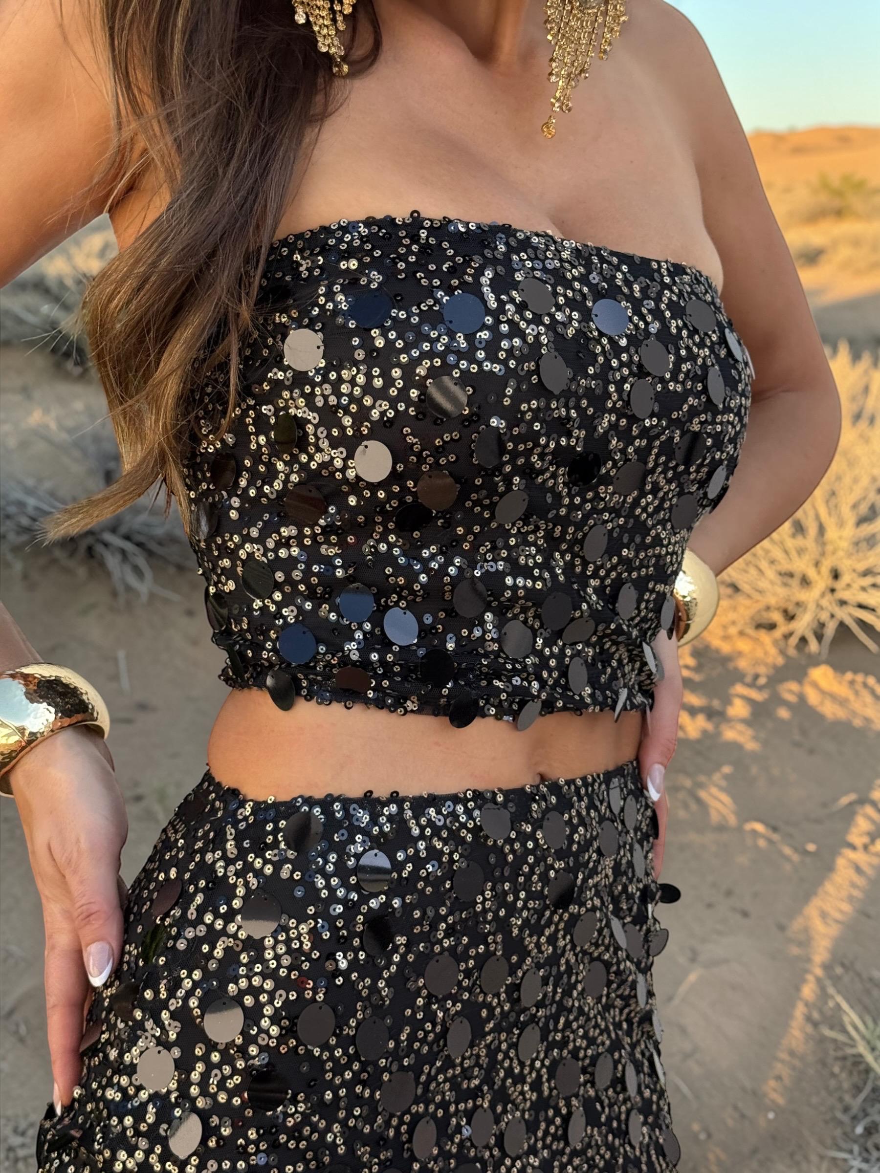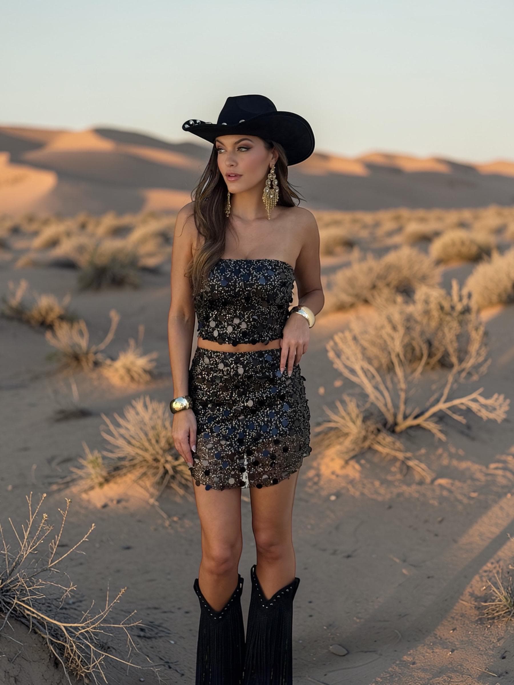 This two-piece set features a strapless sequin top paired with a matching mini skirt dripping in navy fringe, designed to catch every flash, every spotlight, every stare. The extreme shine of the black and gold sequins creates a dazzling disco-cowgirl effect that moves beautifully with your body.