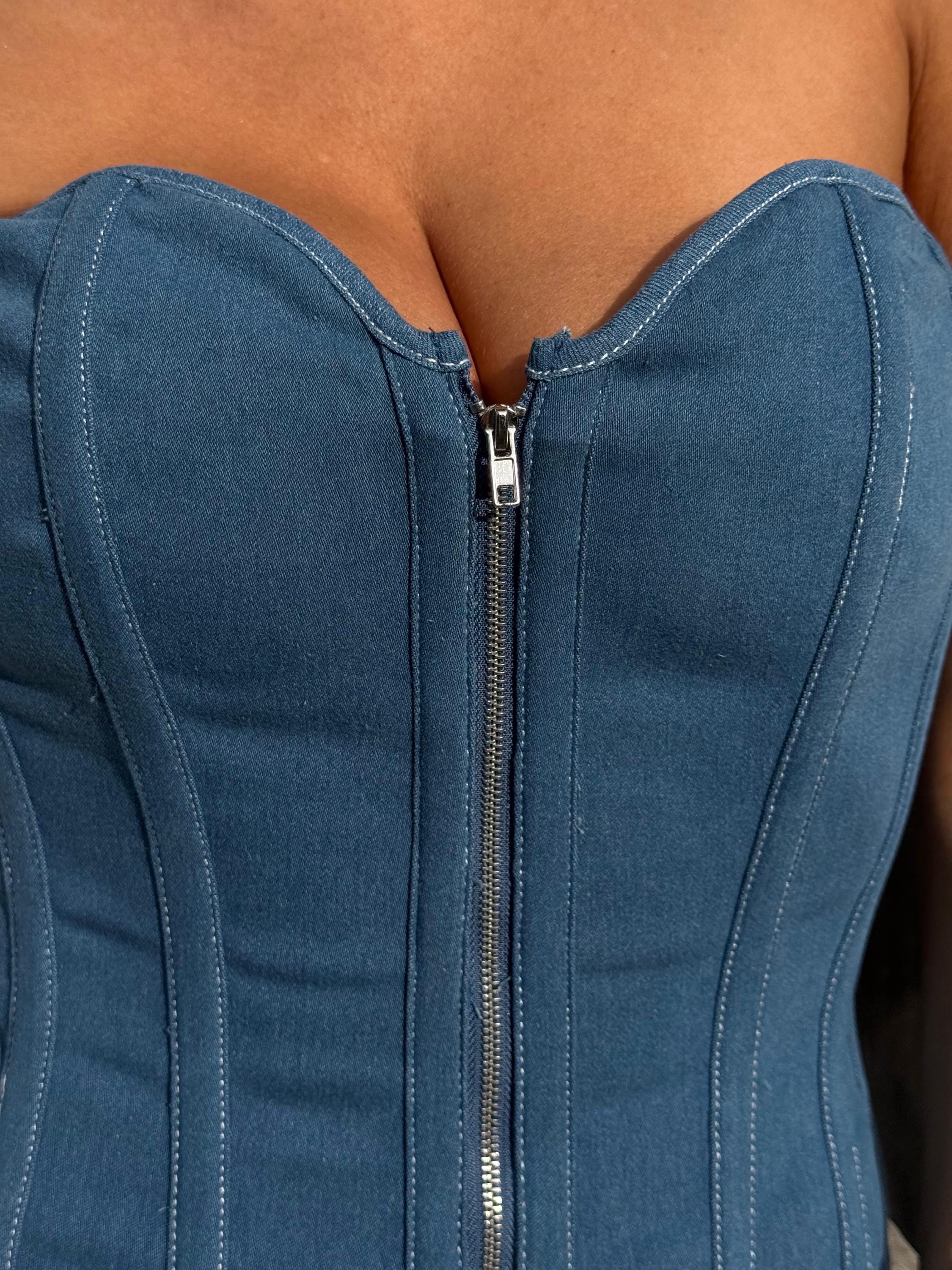 Designed with a bold zipper front closure and adjustable lace-up back, it cinches the waist while giving that snatched, hourglass silhouette. The sweetheart neckline adds a feminine contrast to the rugged western denim, blending soft and strong energy in one unforgettable piece.