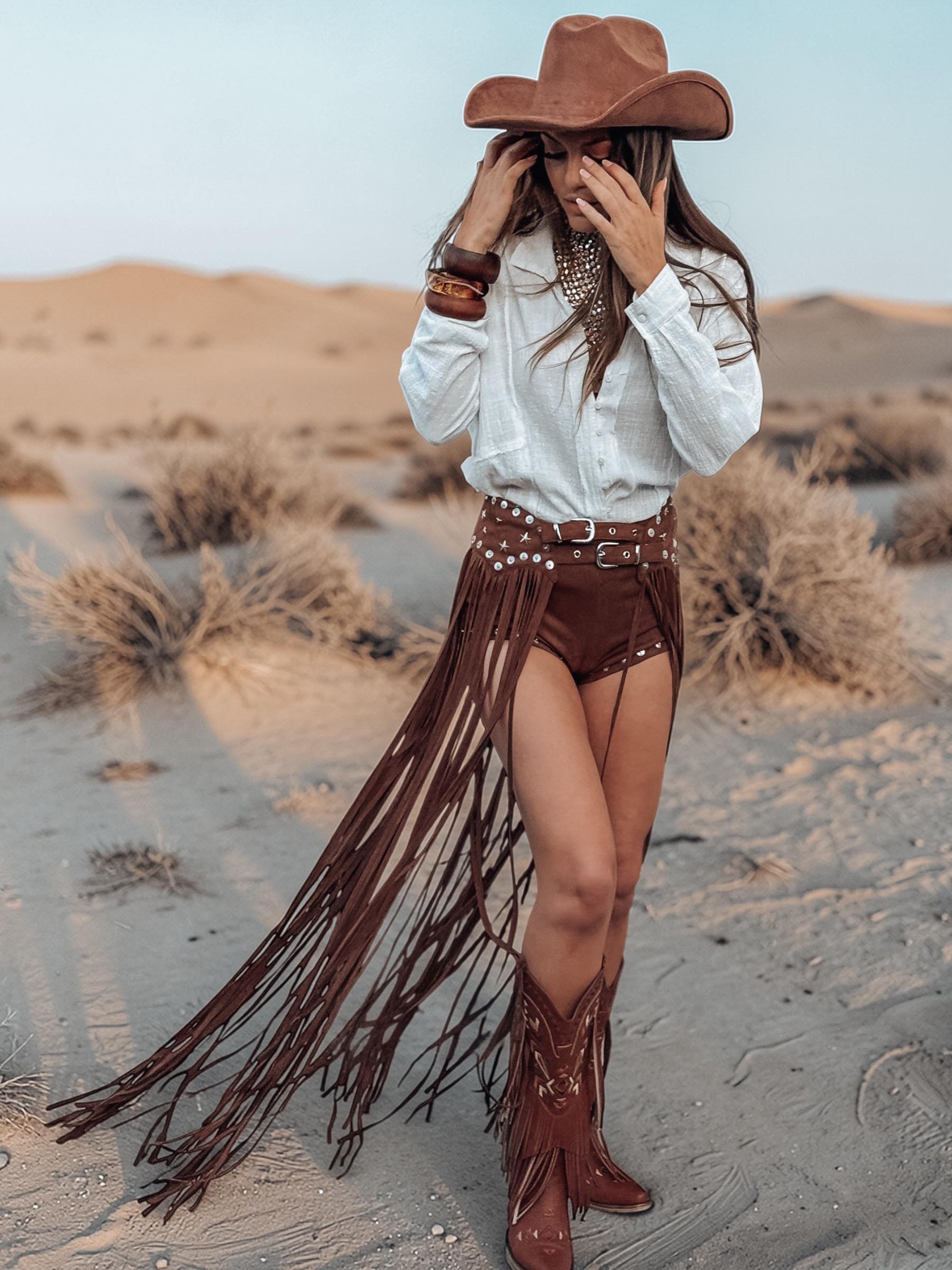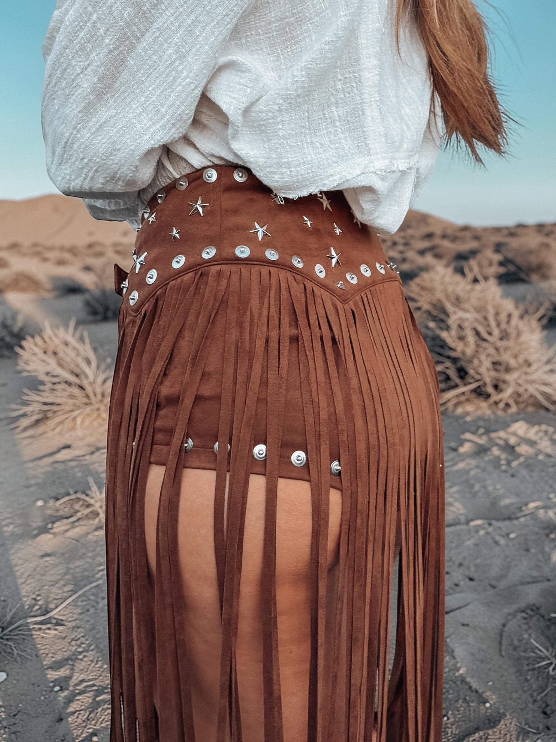 This two-piece statement set features brown studded faux suede micro shorts paired with a dramatic long fringe studded western belt. Crafted from rich faux suede, the texture feels soft yet structured, while the metal stud detailing adds that rugged cowgirl edge.