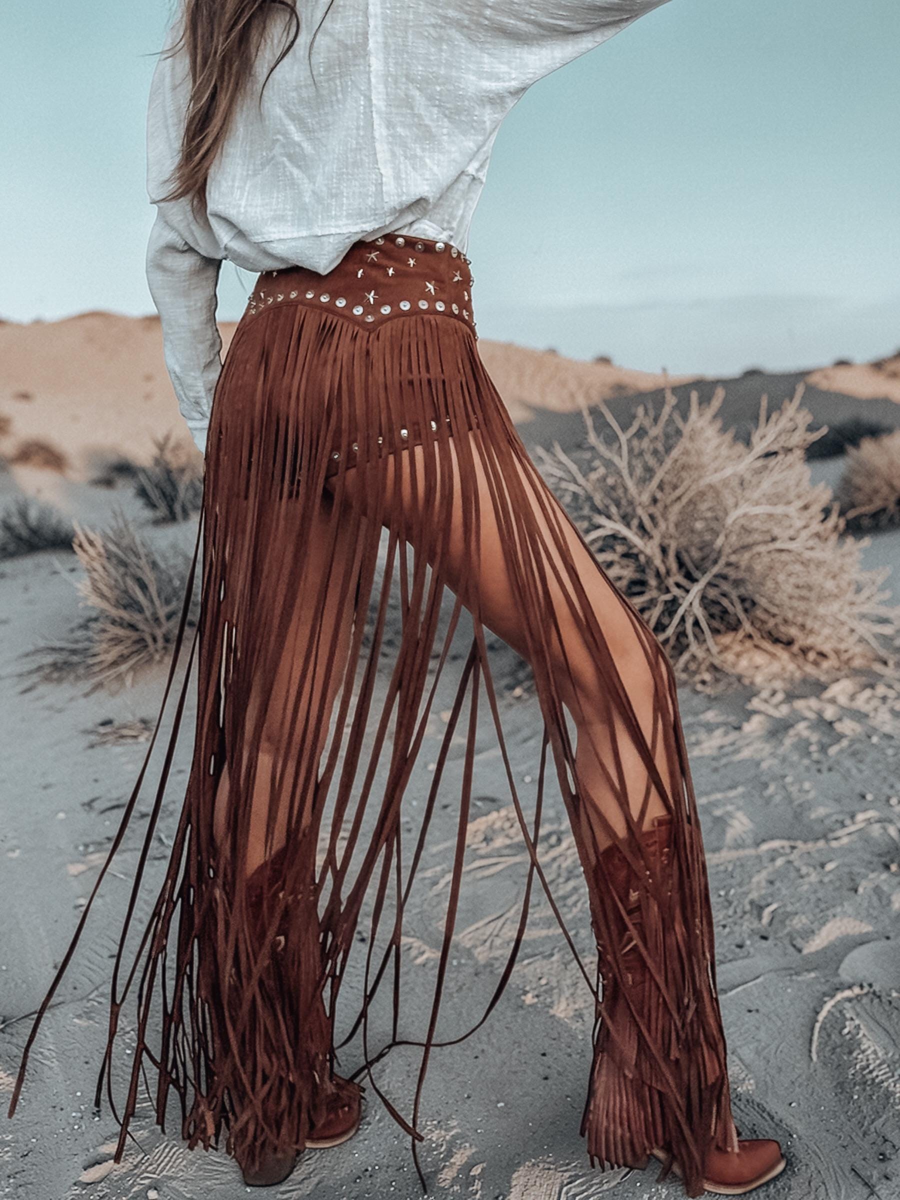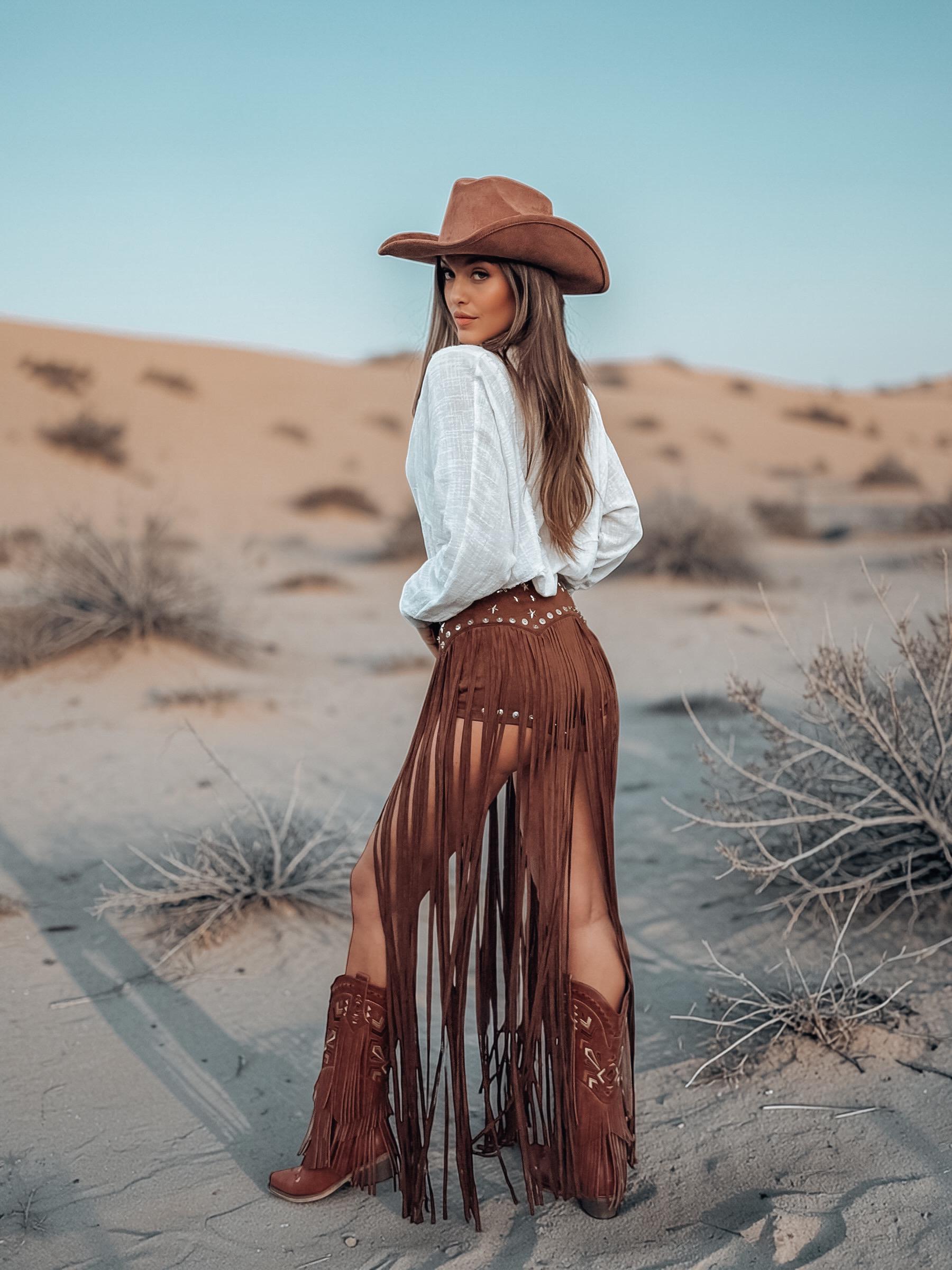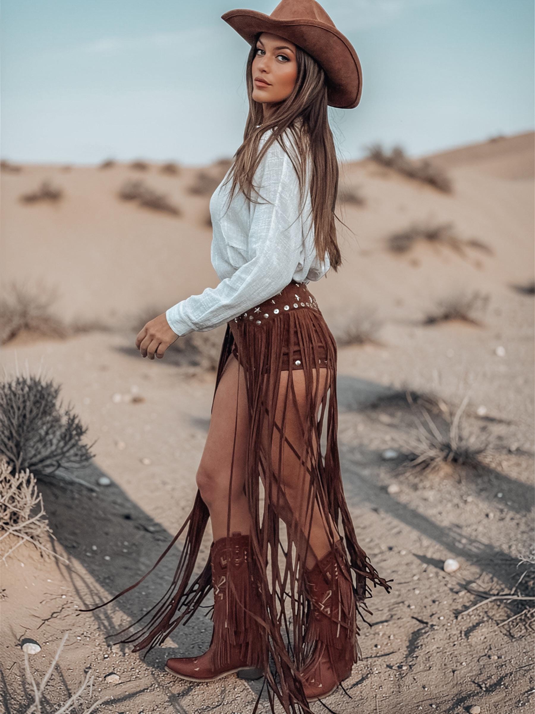 The real standout is the extra-long fringe belt, designed to move with every step — creating a mesmerizing western silhouette whether you’re dancing on festival grounds or styling for a concert night.
