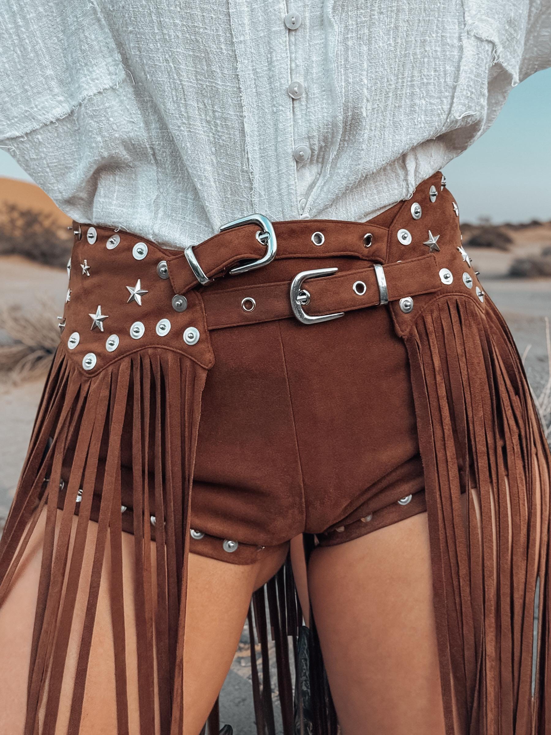 Faux Suede Fringe Shorts Set, Western Festival Fringe Shorts, Studded Cowgirl Belt Outfit, Rodeo Cowboy Outfit, Cowgirl Festival Shorts