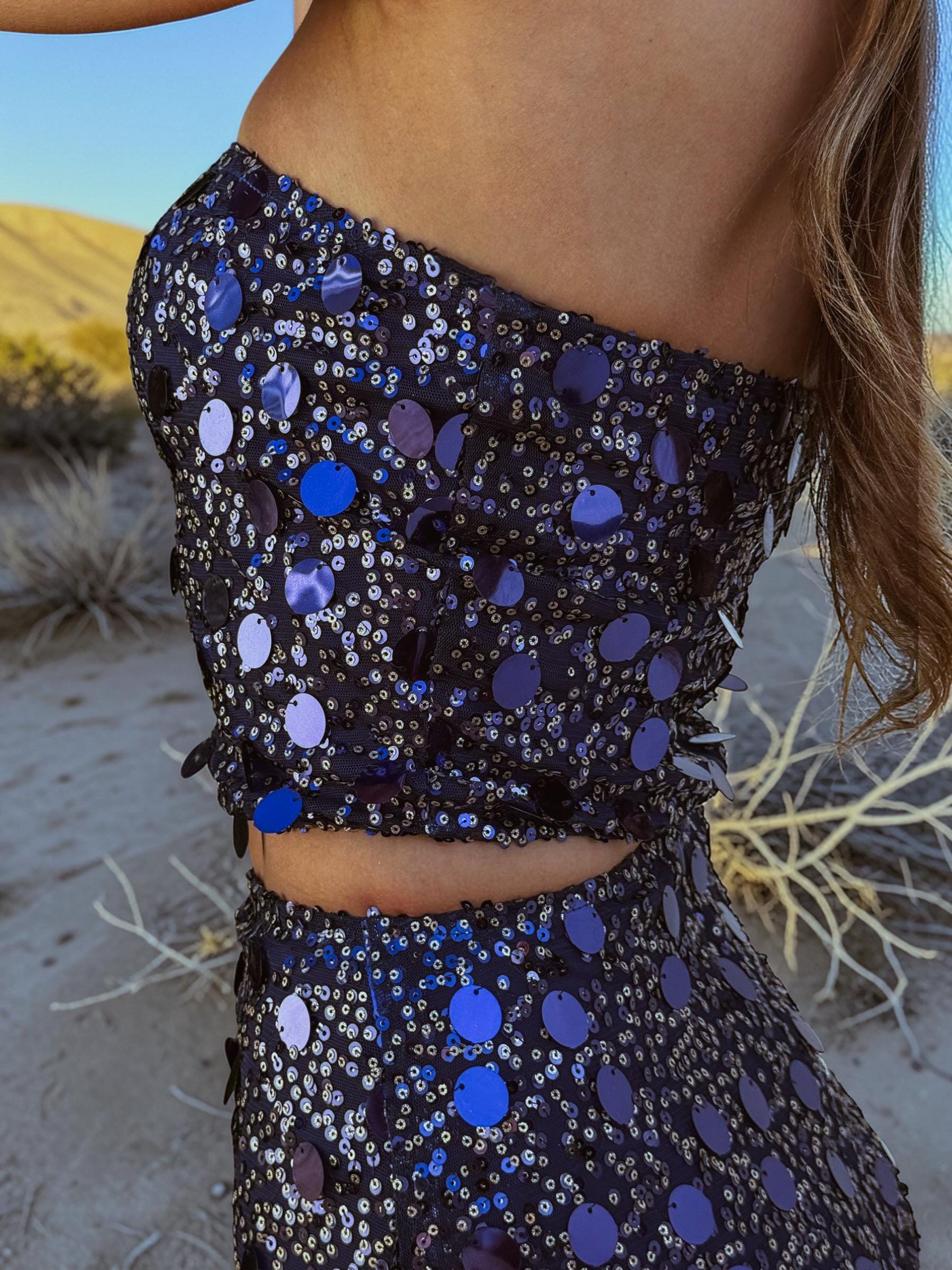 This two-piece set features a strapless sequin top paired with a matching mini skirt dripping in navy fringe, designed to catch every flash, every spotlight, every stare. The extreme shine of the navy and gold sequins creates a dazzling disco-cowgirl effect that moves beautifully with your body.