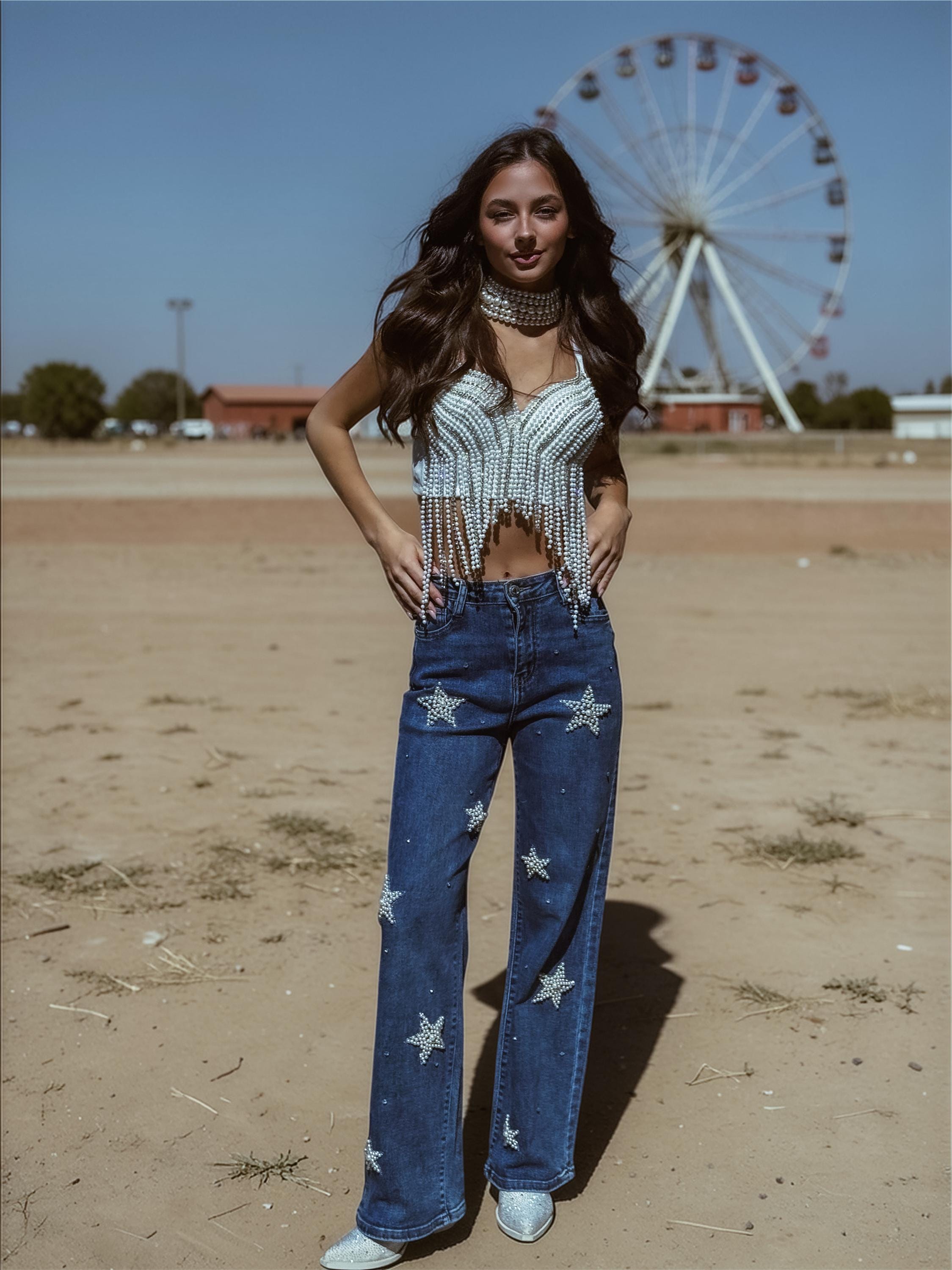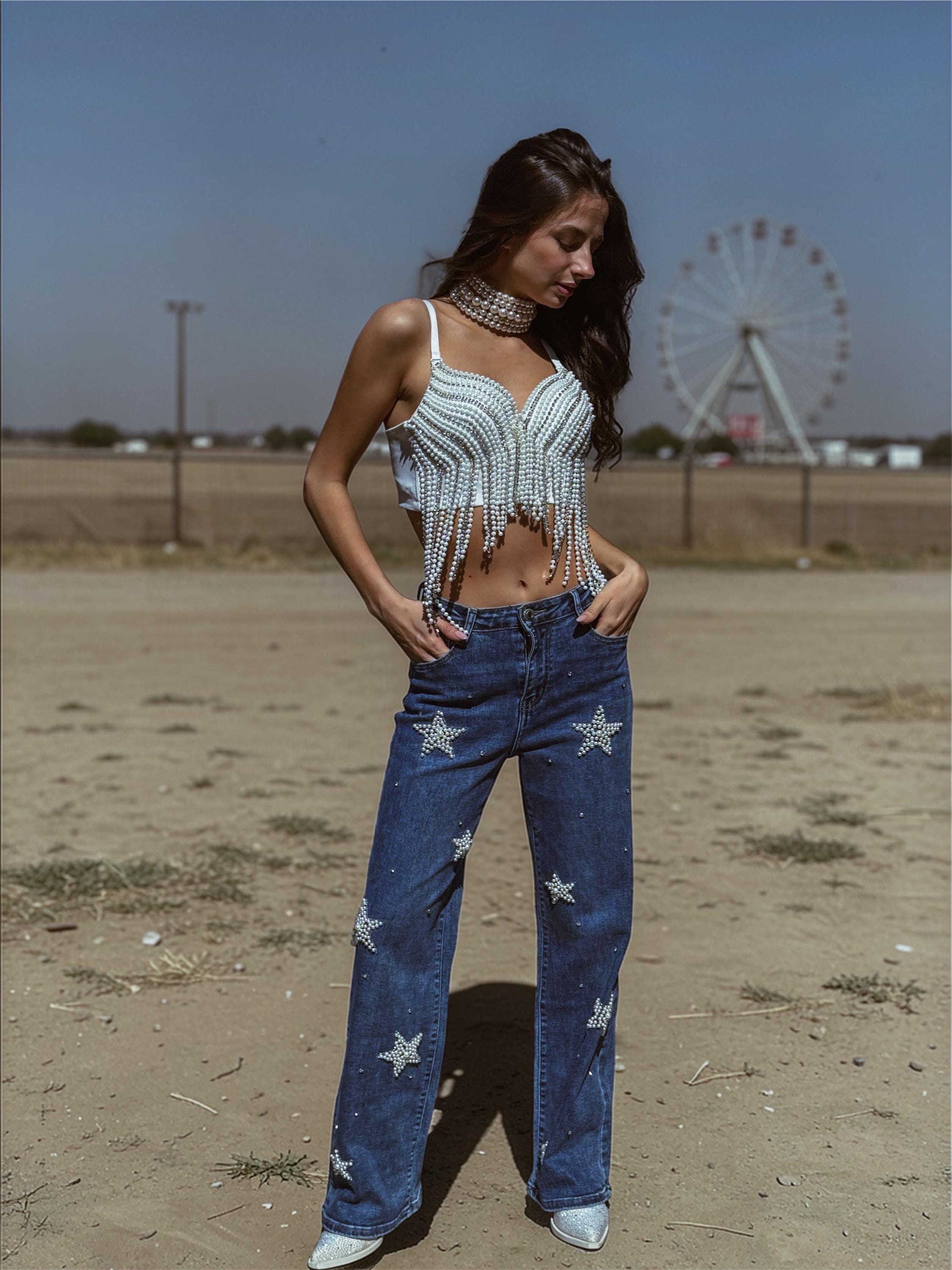 Bring celestial cowgirl energy to your wardrobe with these Pearl Embellished Western Denim Pants — where classic denim meets radiant bridal sparkle.