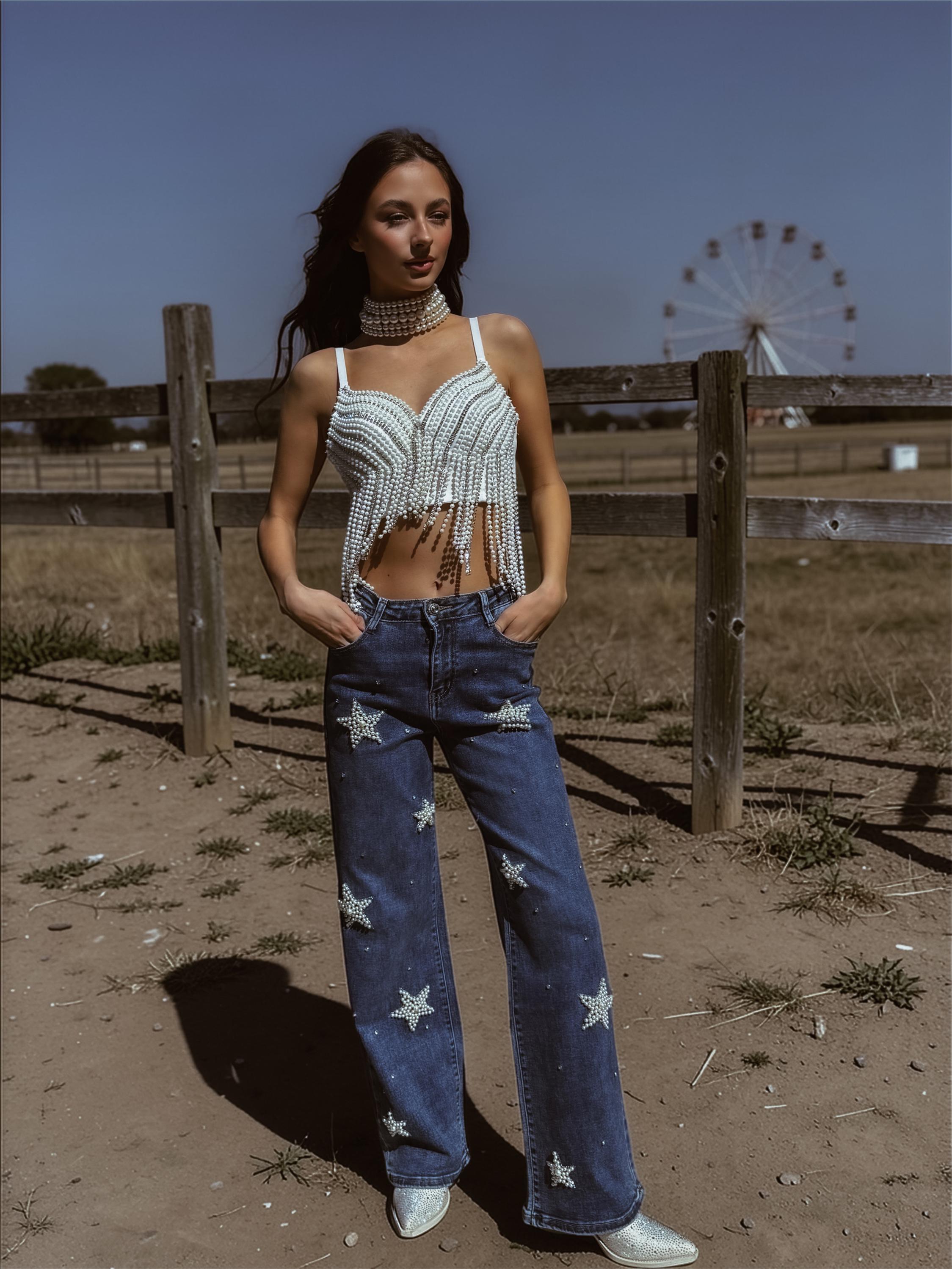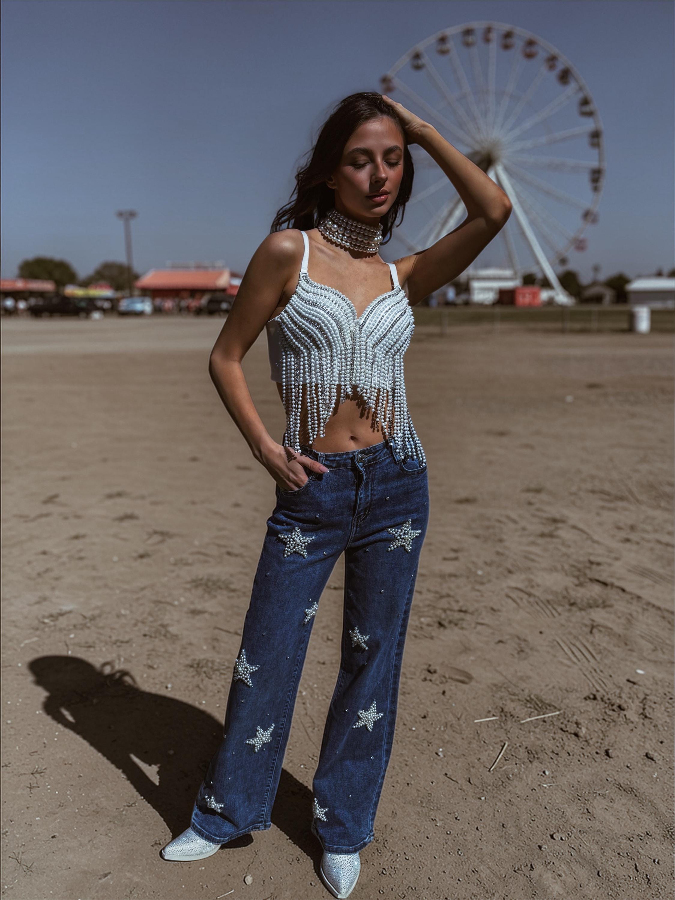 Pearl Embellished Western Denim Pants, Rhinestone Star Flare Jenas, Cowgirl Festival Outfit, Disco Cowboy Jeans, Celestial Festival Outfit