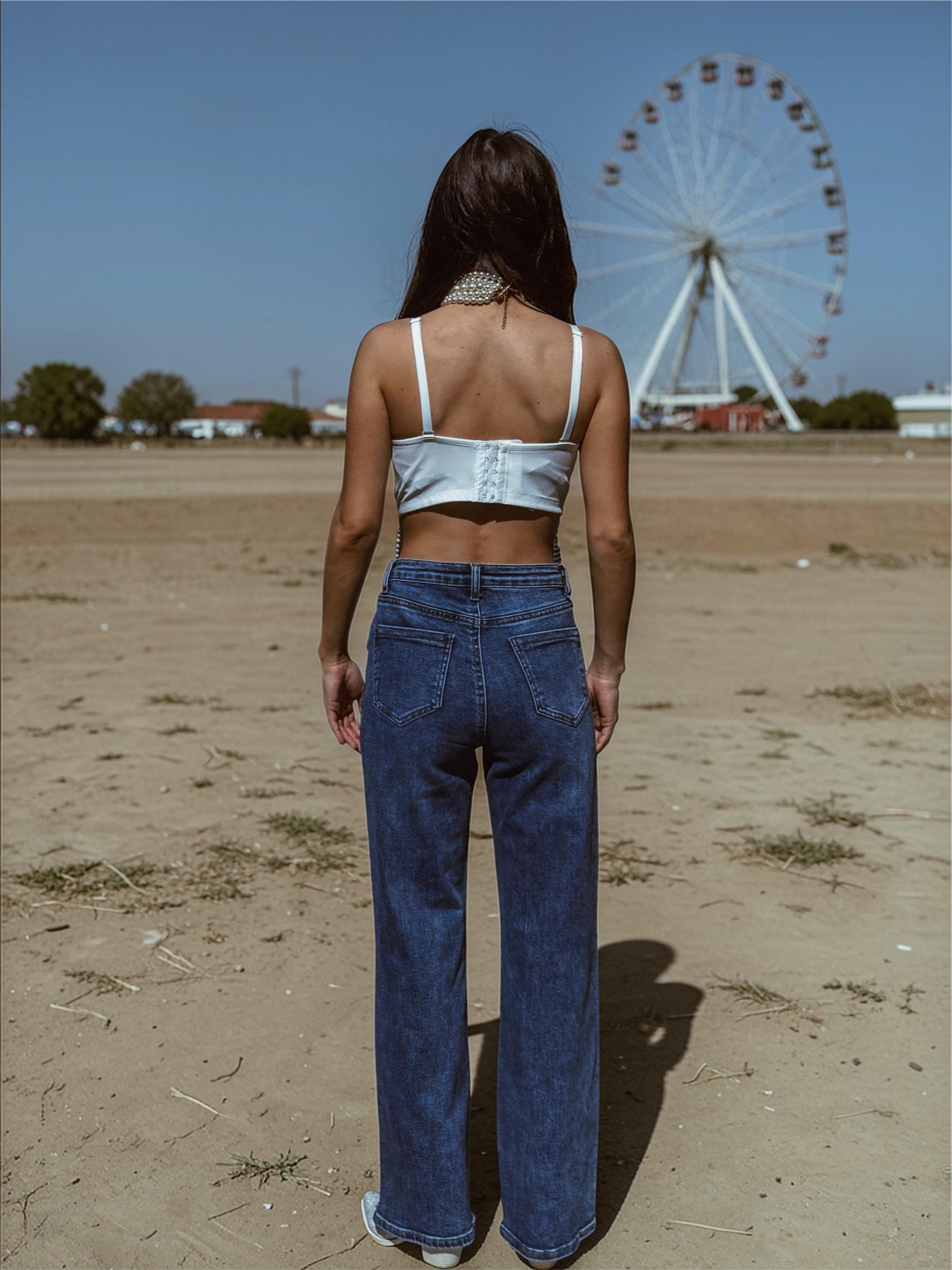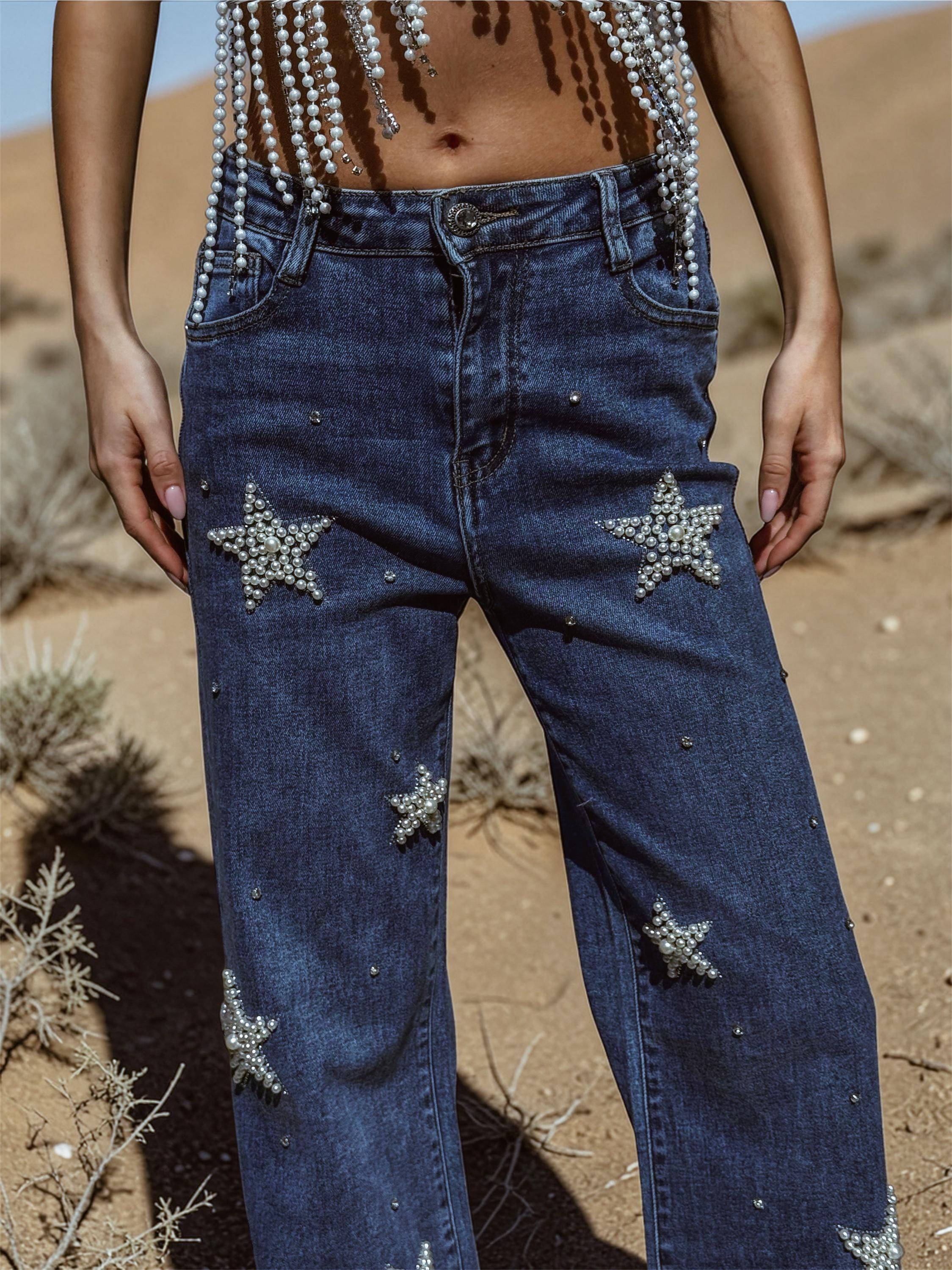 Crafted from a rich mid-dark washed stretchy denim, these high-waisted flared pants sculpt the waist while elongating the legs for a flattering, confident silhouette. The standout detail is the dreamy star-shaped pearl embellishments, accented with rhinestones that shimmer beautifully under light.