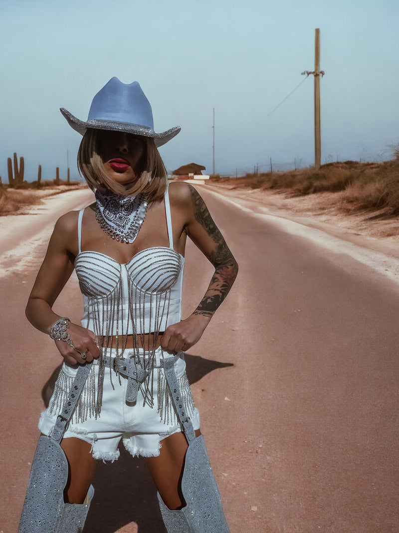Turn heads and steal the spotlight with the Western Diamond Long Fringe Cropped Bustier Topthe ultimate show-stopping piece for any occasion. Designed for comfort and flair, this top features adjustable straps for a perfect fit and extra-long fringes that dazzle with every move.
