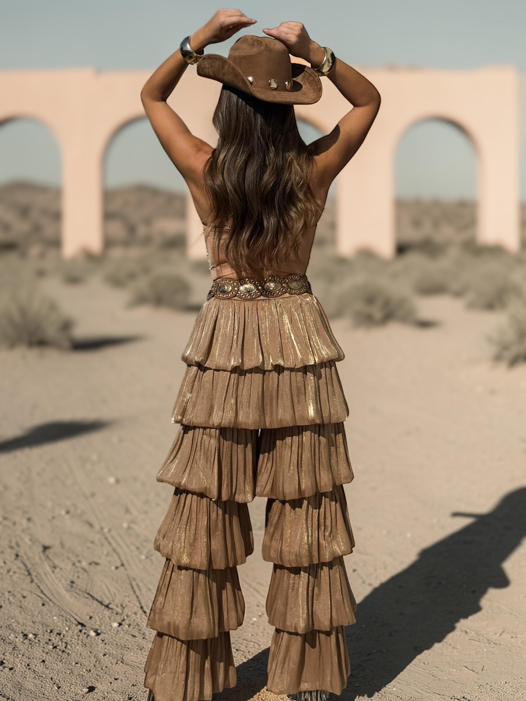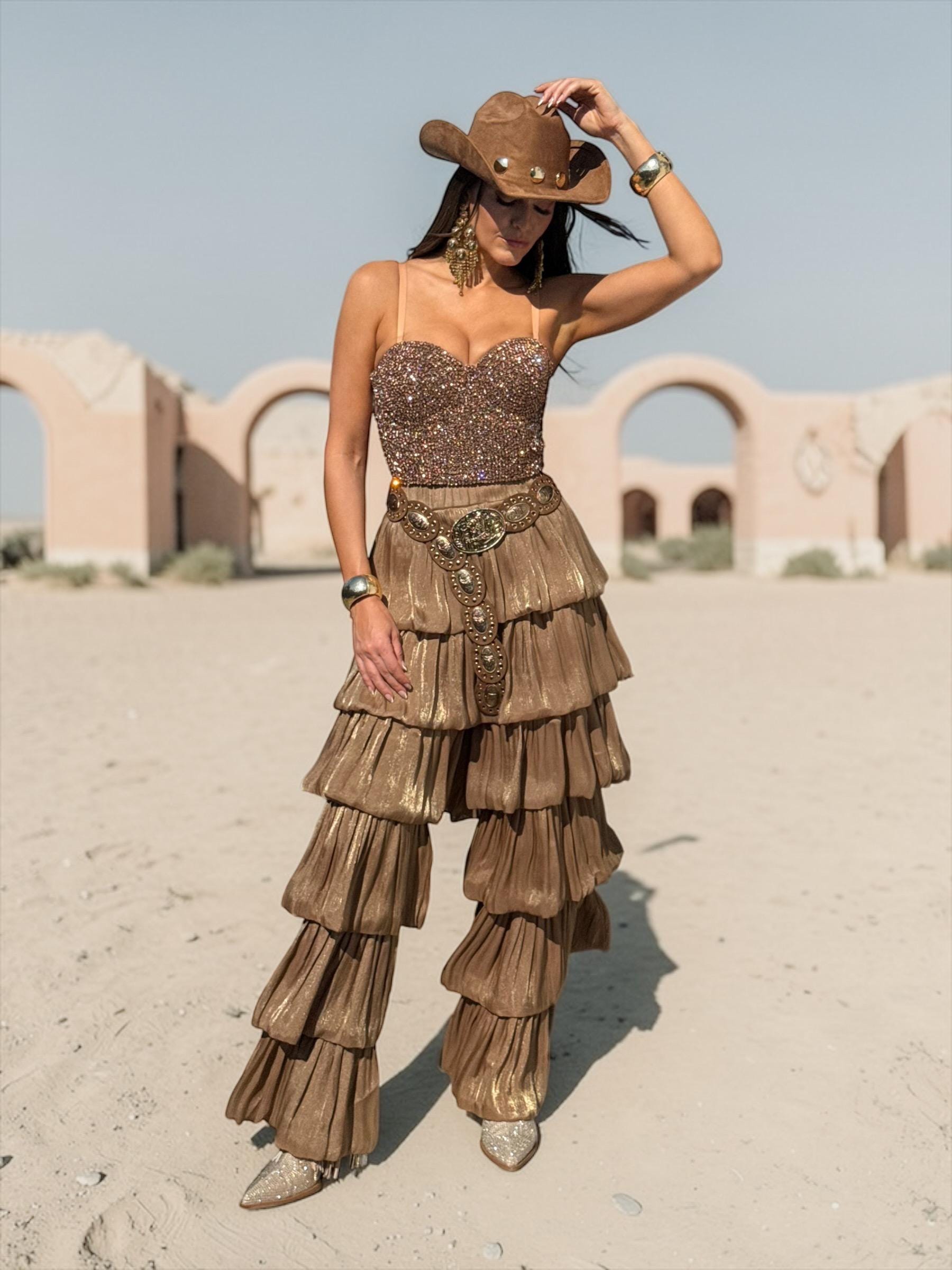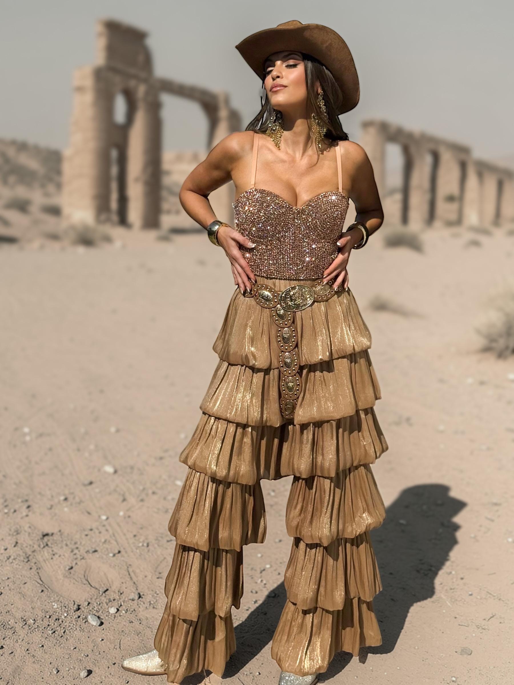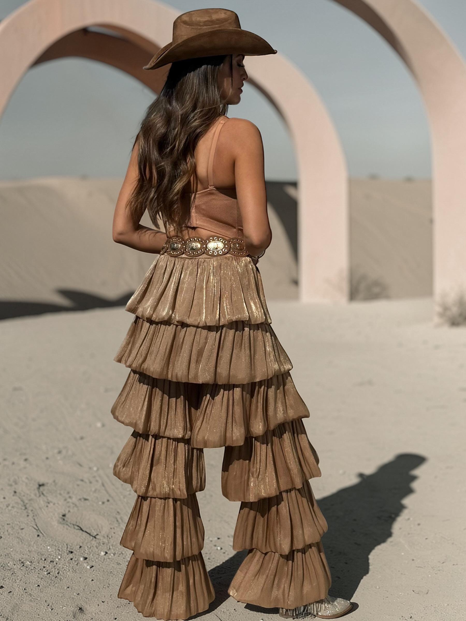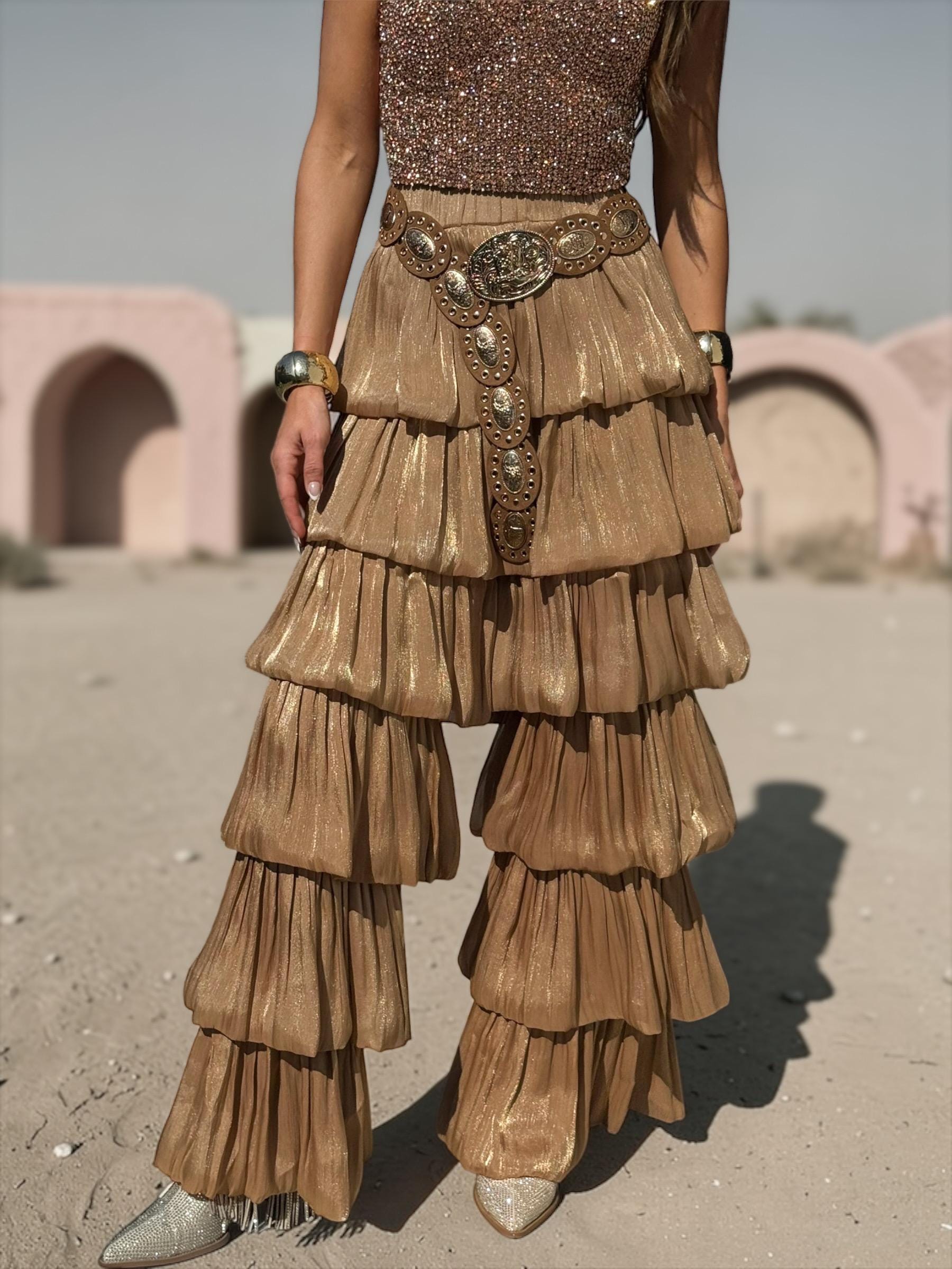 Featuring cascading multi-layer ruffle tiers, these pants create a flowing silhouette that moves beautifully with every step. The lightweight shimmering fabric adds subtle golden glow, making them perfect for sun-soaked festivals and electric concert nights.