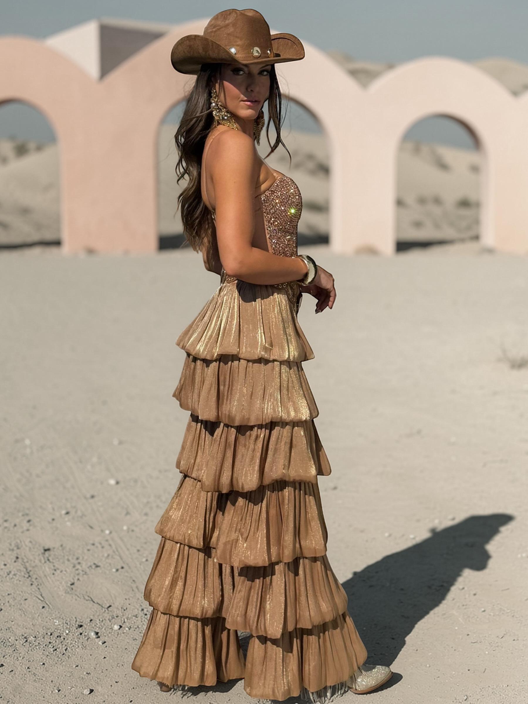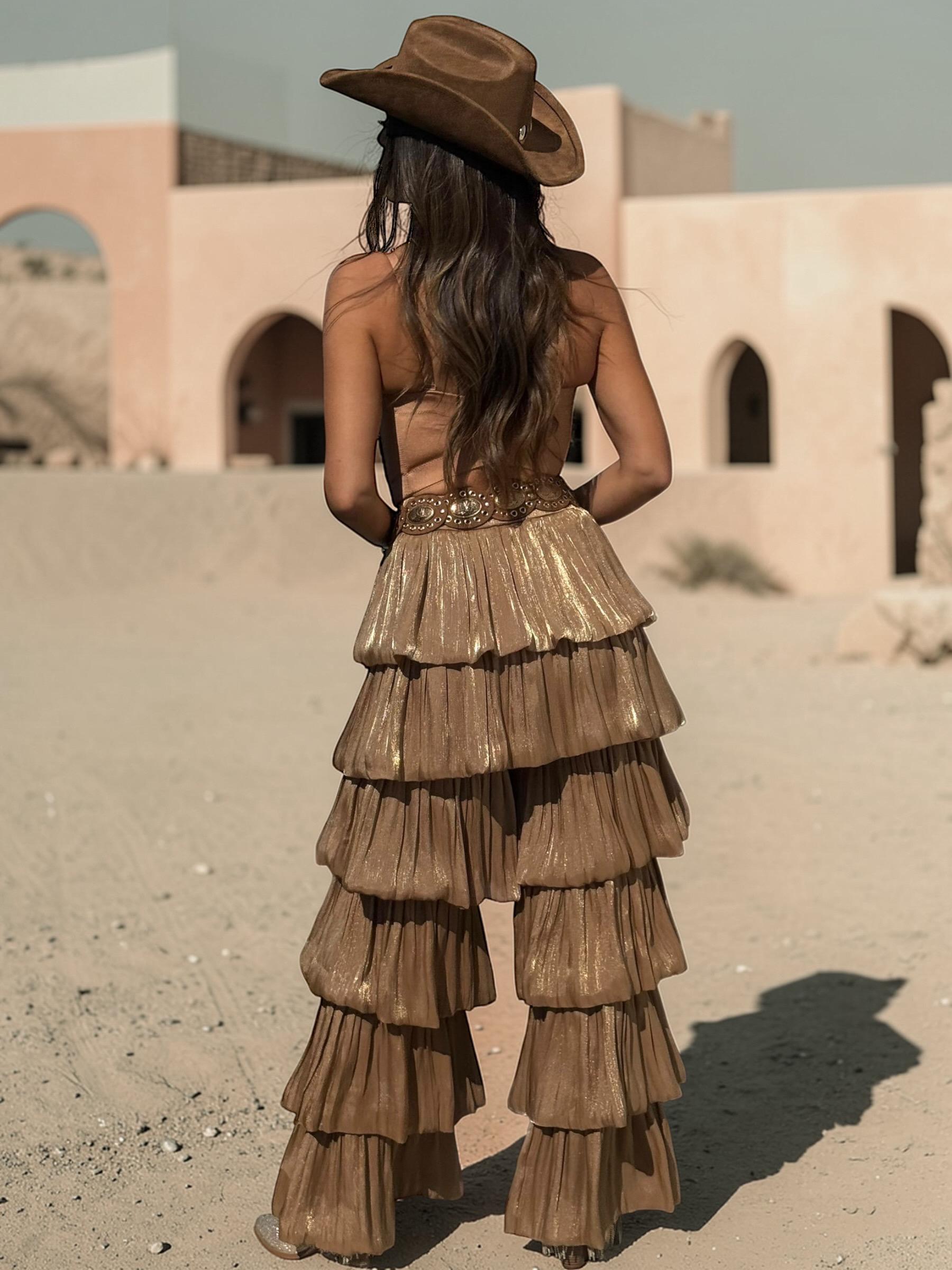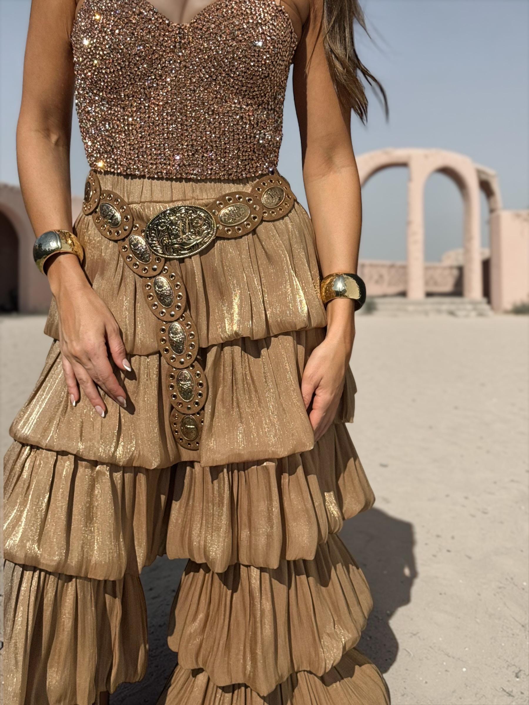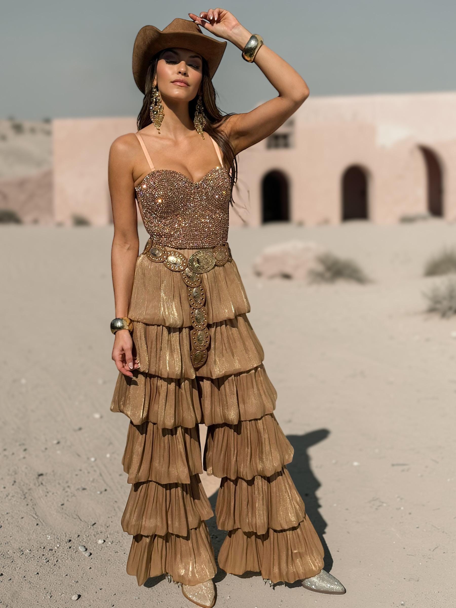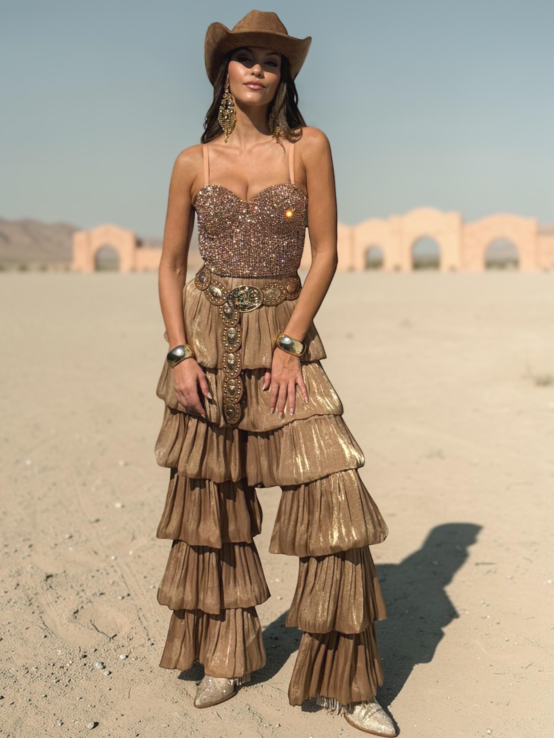 Featuring cascading multi-layer ruffle tiers, these pants create a flowing silhouette that moves beautifully with every step. The lightweight shimmering fabric adds subtle golden glow, making them perfect for sun-soaked festivals and electric concert nights.